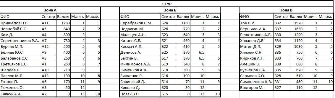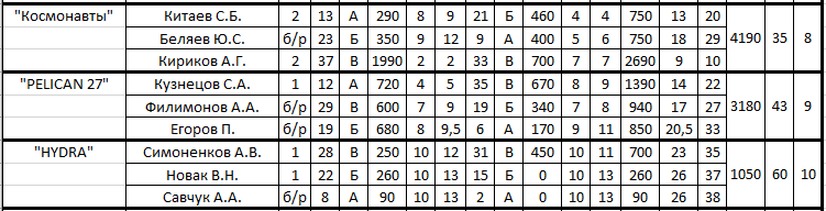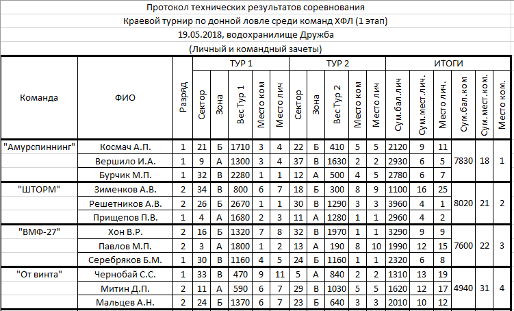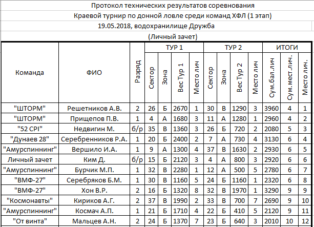 спасибо за все!)) очень приятно было показать себя, хотя было мне не просто!)))Прошел первый этап ХФЛ в новом сезоне. Результаты довольно интересные. Количество участников повторилось как и в 2014 - 37 человек. Приятно видеть новые лица как из местных спортсменов, так и из гостей из Благовещенска. Хотелось бы отметить людей, которые показали высокие результаты во перки ожиданиям: Кияшко Дмитрий (личный зачет) - взял зону в 1 этапе, обойдя многих именитых спортсменов, Ким Дмитрий (личный зачет) - во обоих турах попал в тройку в свой зоне и это в первые свои соревнования, Недвигин Максим (команда 52CPI) - бронза в личке за этап. Так же хочу отметить благовещенские команды. Парни приезжают за 800км с одной треней и показывают уверенные результаты на трудной рыбе. Браво!