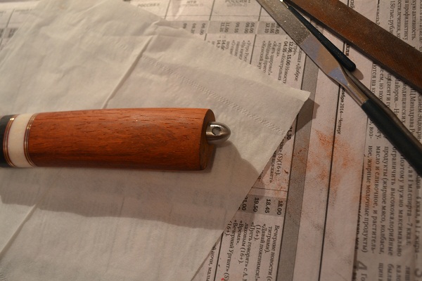 Ну вот, тыльная гайка приобрела форму, подогнана и отполирована. Нож почти готов - впереди снятие небольшой доли дерева на рукояти, полировка больстера и покрытие маслом...