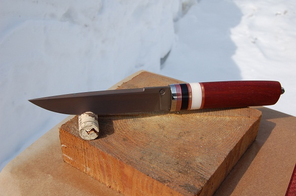 Я стараюсь делать контрастнее - что бы нож привлекал внимание. Поэтому к полированной нержавеющей стали - эбонит, а к потемневшему при пропитке падуку - почти белый кореан.