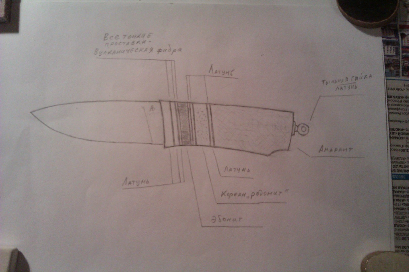 - Рисую на миллимитровке контур торца больстера (наружные размеры с небольшим запасом), размечаю на на нем отверстие для клинка.