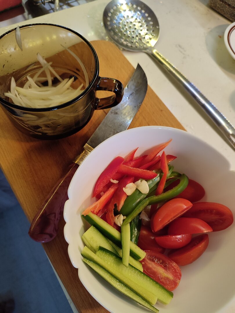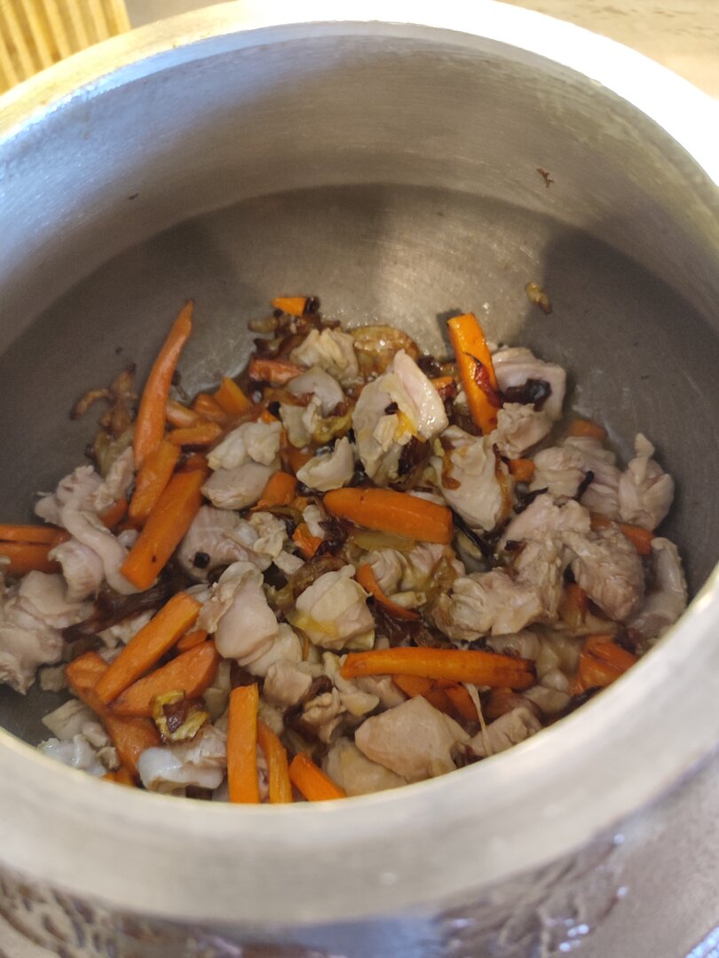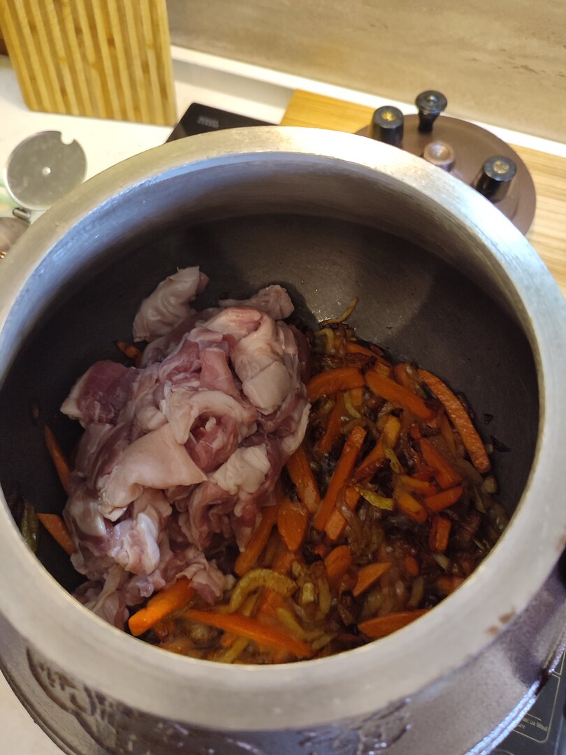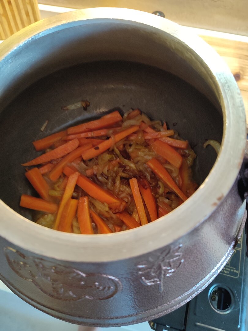 Лук обжарил, потом морковка, обжарилась, баранину добавил.
