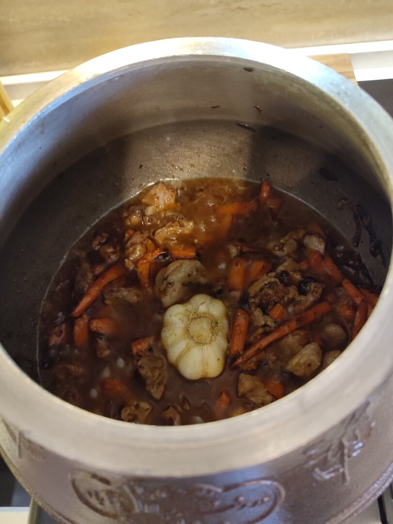 У нас своя птица, собрали от индейки курицы и утки лапы, косточки с обрезью (для тушенки делали). Заложил всё в казанок, одна большая морковь кусками порезал. Две средних луковицы целиком, соль столовая ложка с горкой (казан 5л), две лаврушка и жменьк чёрного перчика горошком. Завинтил и на плиту. 1,5 часа с момента, как закипел. Затем отделяем мясо от костей и заливаем бульеном, предварительно выдавливаем чеснок на мясо, которой разложили в формы.