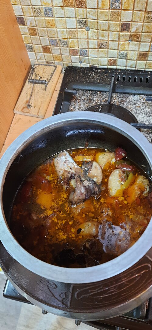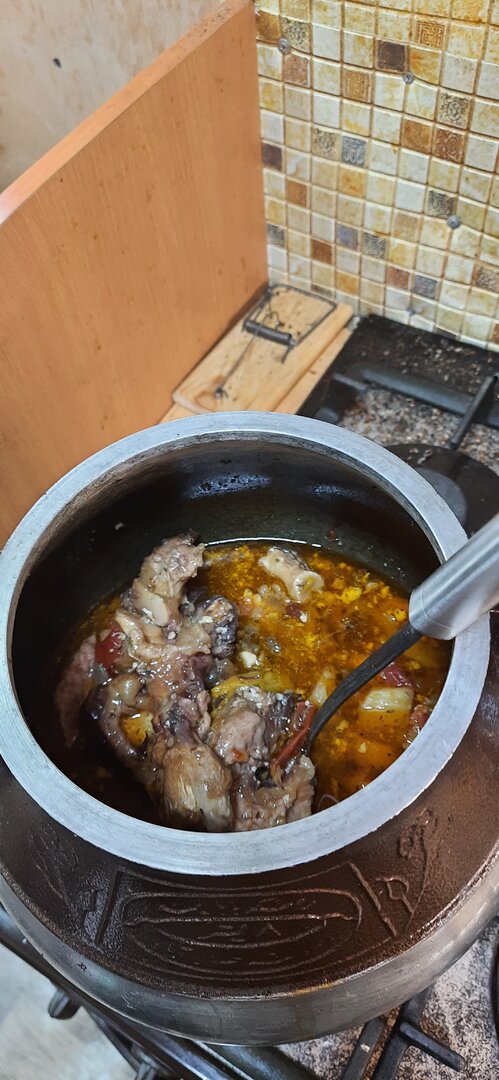 Сейчас в гараж (что б не было мучительно больно на кухне) сходил. Выключил варево в афганском казане. Три кусочка сохатины, две луковицы, четыре моркови и два пучка петрушки с корнями и ложка соли. Только сейчас начал перечислять и вспомнил, что перец горошком и душистый забыл. Остывает.