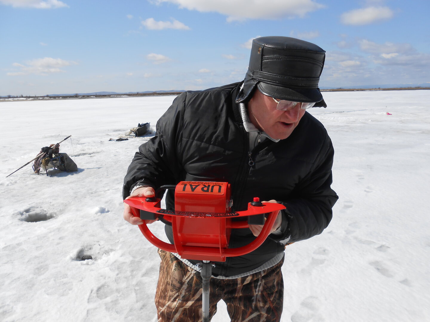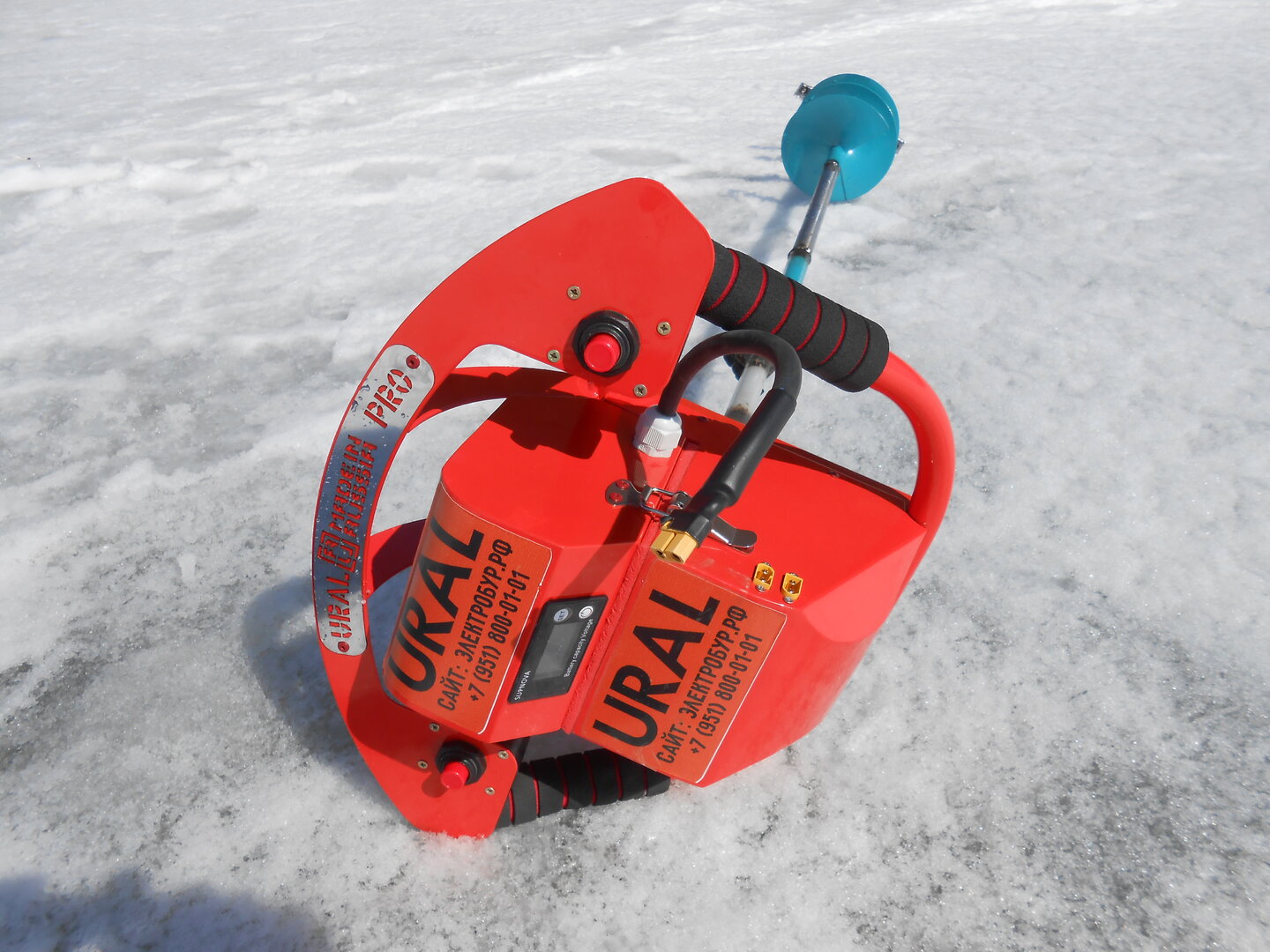 Я был несколько потрясен, увидев, как абсолютно бесшумно, рядом со мной сверлится лунка, достаточно большим шнеком, и когда позже я подошел к счастливому обладателю этого чуда, он мне пояснил следующее. Это наш российский электрический бур «Урал», о котором я кстати читал в рекламных роликах, изготавливается у нас, работает на АКБ, которая заряжается через свое зарядное устройство, крутит вполне уверенно, но порой закусывает, отчего доставляет неприятности оператору кручения. Стоит данный агрегат более 30 тыр. Без шнека.