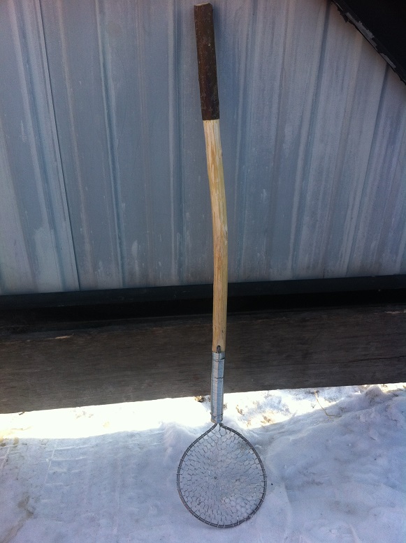 Тут тебе и собственно "черпалка" (так как сосиски на костре не жарю, сплёл из лески, от льда очищается легче, одним ударом о носок сапога),