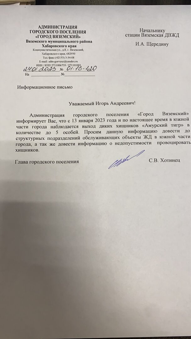 Около 19 часов 29 января в районе кладбища в городе Вяземском специалистами управления охотничьего хозяйства Правительства Хабаровского края был произведен отлов тигра, державшего в напряжении жителей города и близлежащих поселений с 13 января. Отловленный тигр - крупный самец. Дальнейшую судьбу хищника будет решать министерство природных ресурсов РФ.