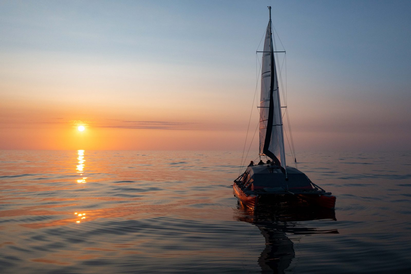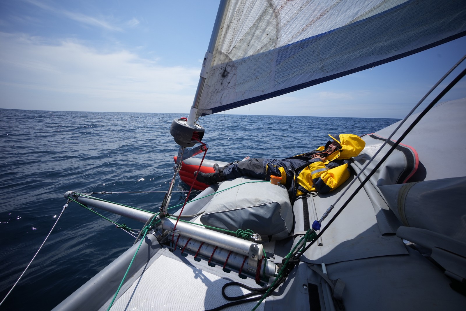 Далее смотрю: ветер умеренный, стаксель открыт почти на полную площадь. Скорость 8 км/ч. Нормально, для ночной вахты самое то. Миша меня покидает. Я какое-то время наблюдаю за ним, как он разбирается после вахты в каюте, расположившись на рундуке, потому что это самое интересное для меня сейчас, время второй час ночи и вокруг не видно ничего. Совсем. Двигаюсь в ночном пространстве, с подсвеченным лицом от экрана картплоттера. Прямо как у Кубрика в Одиссее, в сцене, где космонавты в космическом пространстве со светящимися лицами за стеклом скафандра. Но у них хотя бы были звезды. А у меня нет никаких звезд и скафандра нет. Ветер в лицо. Знаю, что через час буду уже замерзать. Сколько раз замечал, что именно вахта с часу ночи до трёх самая долгая. Первый час пролетает быстро, но последний еле-еле добирается до своего завершения. Самое интересное, что время с 3 до 5 проходит быстрее, и даже иногда, кажется, что мог бы посидеть ещё. Солнце восходит, все начинает, провялятся как на фотоснимке. Жадно глазами цепляешься за любые детали: за форму облаков, за блики на волнах, за птиц, которые не устают преследовать катамаран. Особое внимание уделяешь мимо проплывающему мусору, как сыщик изучаешь его, пытаешься объяснить его происхождение, и долго провожаешь взглядом покачивающееся пятно на волнах. Вот такое развлечение, когда за бортом четвертые сутки по сути одна и та же картинка.