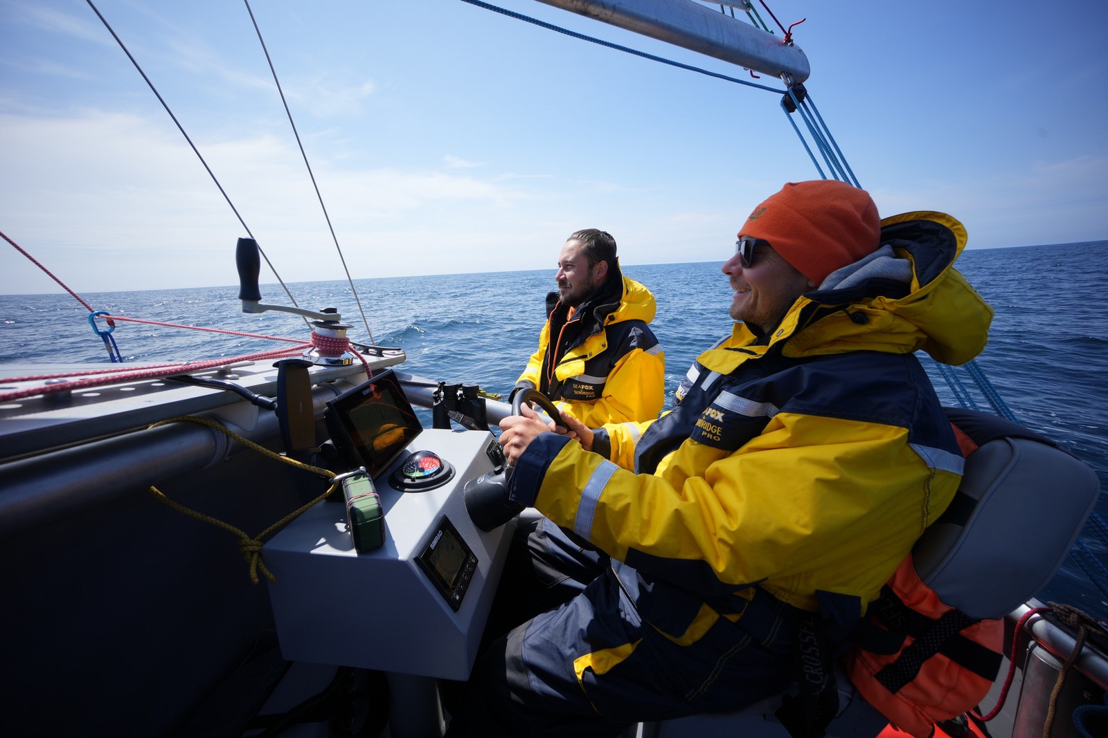 Костя и Миша пытаются поднять грот, но у них это не очень получалось на первых порах. Про себя молчу. Капитану часто приходилось идти на помощь и все вместе правильно настраивали парус. Объяснял им, какие ошибки они допустили и как их можно исправить.