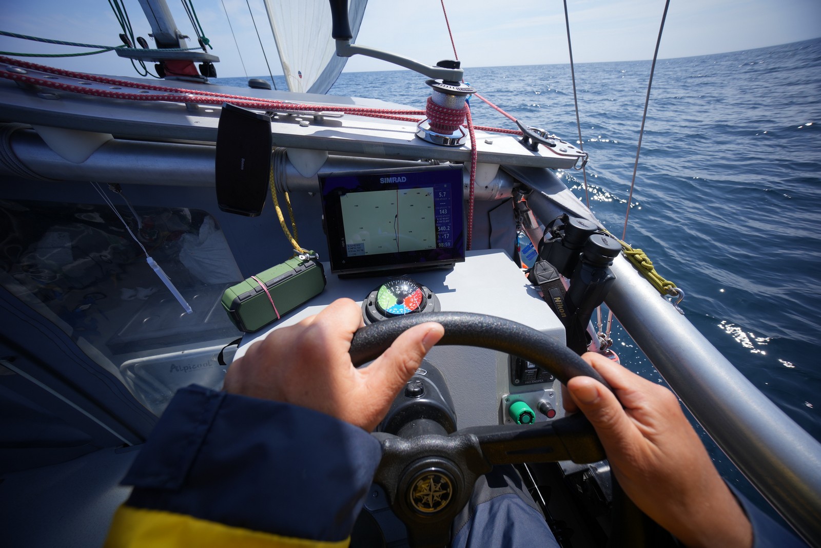 Миша тем временем продолжает: «Вот эти цифры показывают нашу скорость. Сигнал приходит по GPS. Вот здесь должны быть данные глубины, но мы эхолот убрали, поскольку карта показывает здесь глубину 1700 метров, и теперь он нам не нужен. Вот наши данные относительно севера, 120-130 градусов. Дальше идут координаты, долгота и широта. Тут скорость ветра в м/с от датчика анемометра. Здесь видим отклонение от заданного курса в градусах, отрицательное значение, значит, ушли вправо, положительное, значит влево. Сейчас держимся около нуля. Так, и последнее – тайм ту дистрик это время до точки назначения. В данный момент мы наблюдаем…»