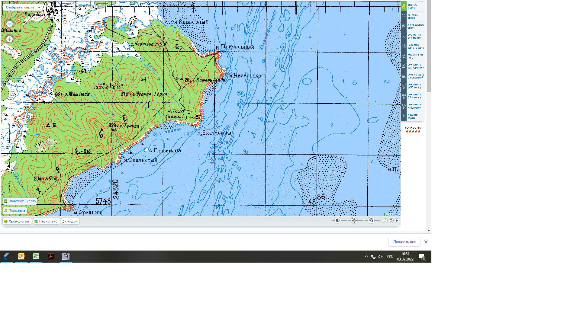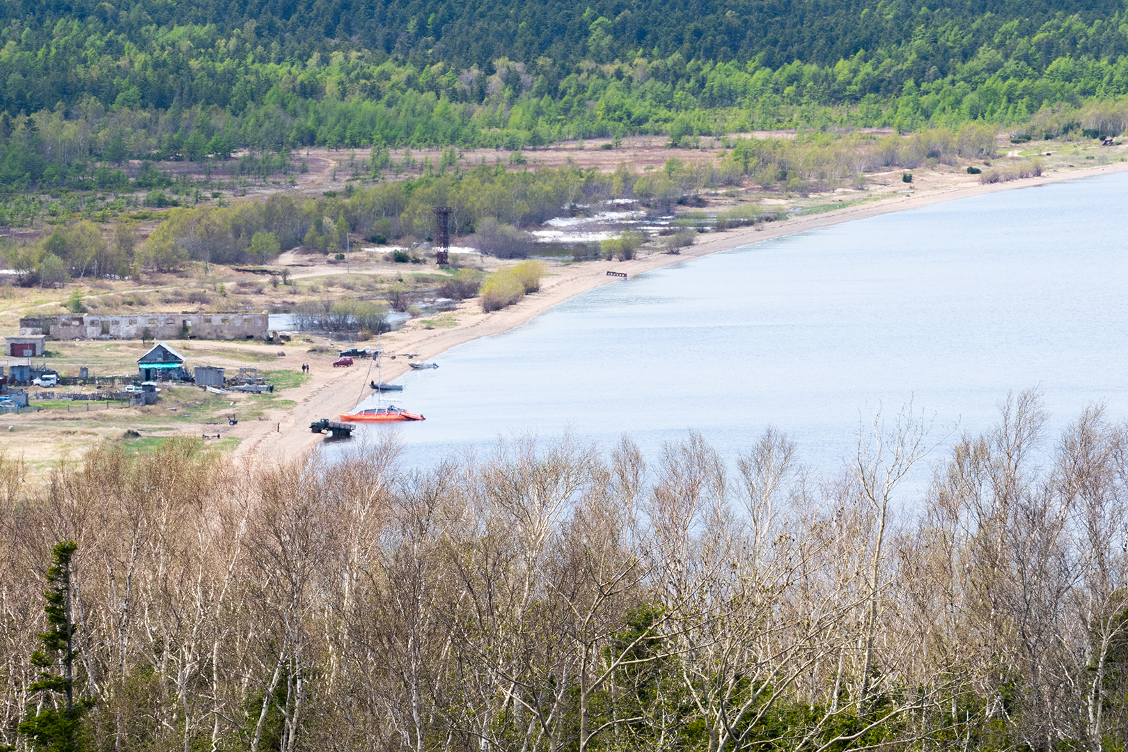 Наверное в районе мыса Причального, там еще избушка или барак на берегу?