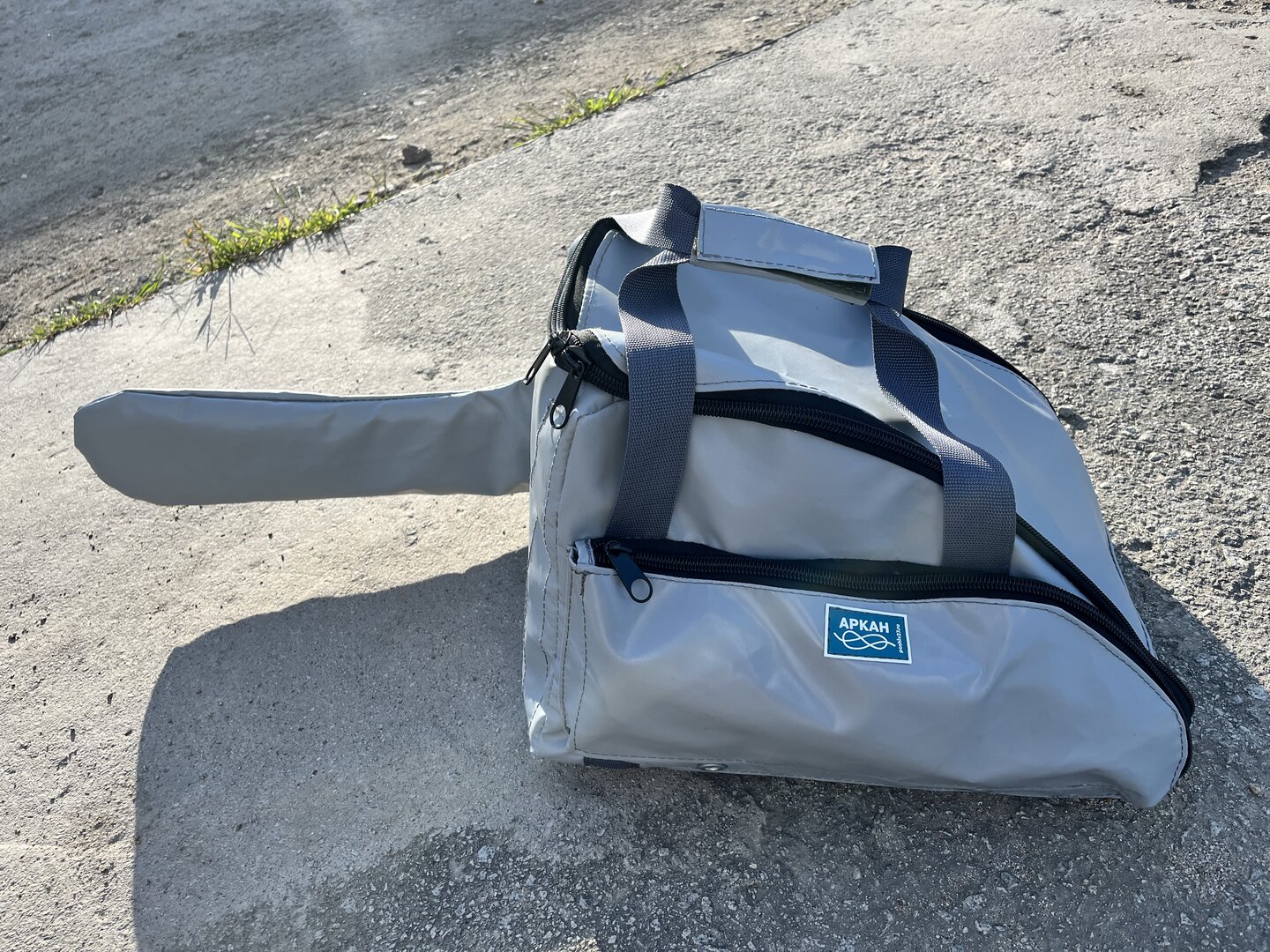 На дно нужен поддон пластиковый с бортиками для случайного сбора масла. Есть оригинальная сумка Хусскварна, там ещё хвост под шину универсальный, если короткая шина, сгибается и на липучку крепится