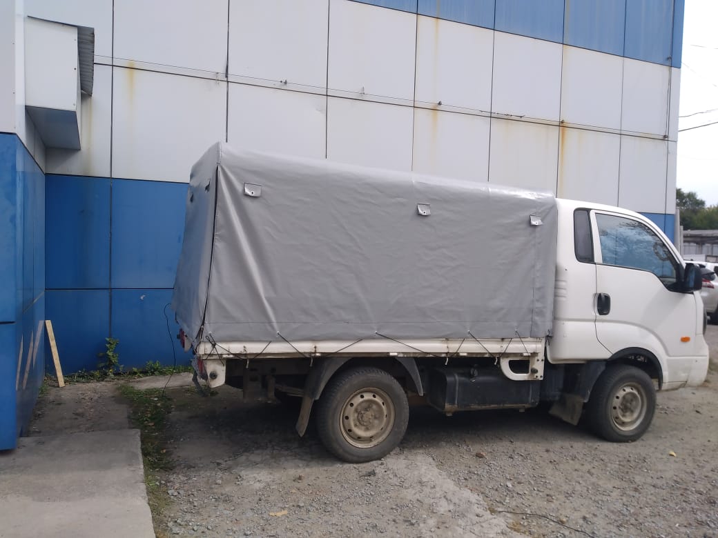 По фото видно, что на кузове располагаются крепления с маленькими поворотными скобами, однако, при изготовлении тента, нам пришлось их заменить, т.к. люверсы, пробитые в тенте не подходили на старые крепления. Как я и говорила ранее, в своем производстве мы всегда используем качественную фурнитуру, так и здесь - были установлены нержавеющие крепления фирмы DOT (люверс+поворотная скоба). Материал для тента - плотный, морозоустойчивый ПВХ. В местах, где расположены дуги, мы дополнительно прошили второй слой ПВХ,чтобы исключить истирание тента.