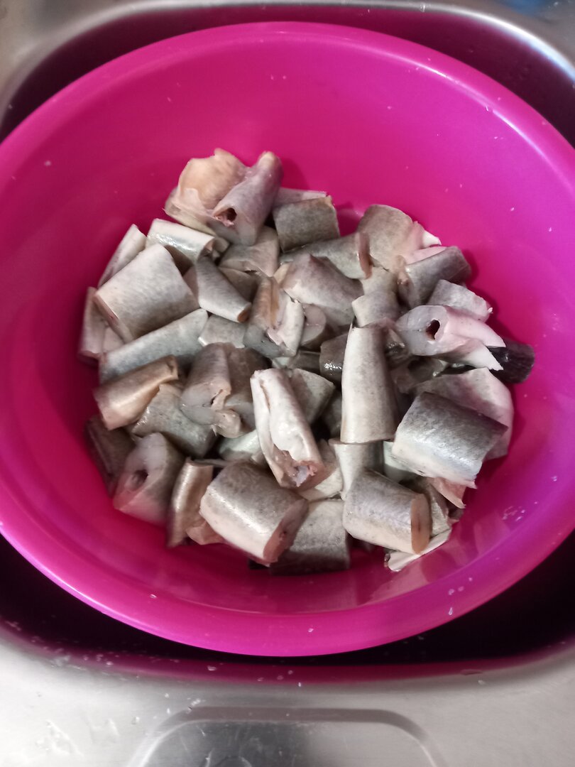 Навагу выпотрошил, хвосты, бошки долой, плавники срезал ножницами.