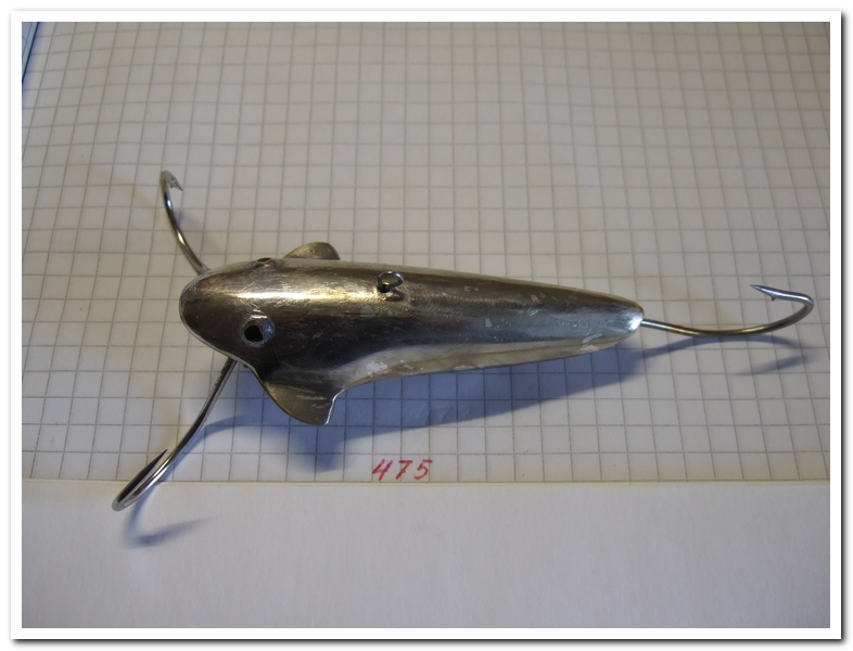 Может быть выполнен из меди или латуни, даже из старых монет. Основа этой - четыре круглых заготовки из нержавейки разного диаметра обжатые на оправке. Скреплены клепками из латунного гвоздика и заполнены снизу припоем. В хвостик впаян тройник 10. Спереди впаяны мощные щучьи крючки, напоминающие усы или клешни креветки.