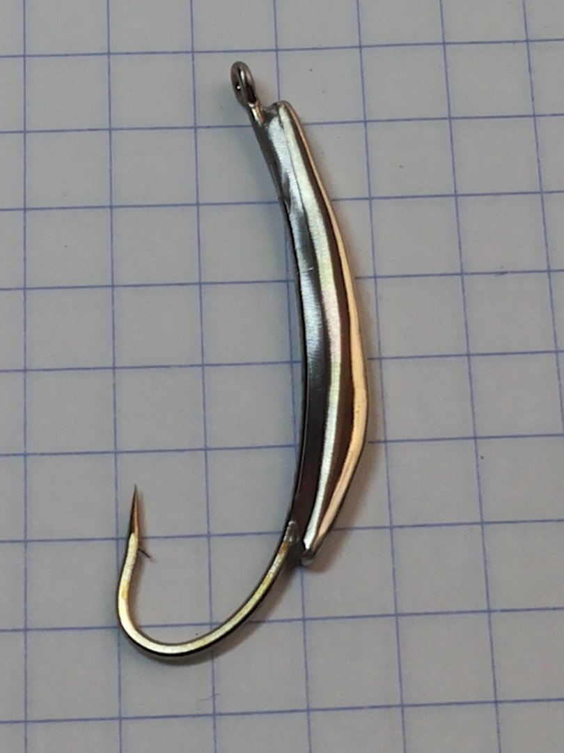 Вот ещё штучка, которая отлично работает в Приморье по корюшке. В тот момент, когда более крупные блёсны перестают работать, мелкие железки творят чудеса. Это одна из них. Двкхцветная , материал серебро + латунь. Олово не использовал, крюк припаян латунью.