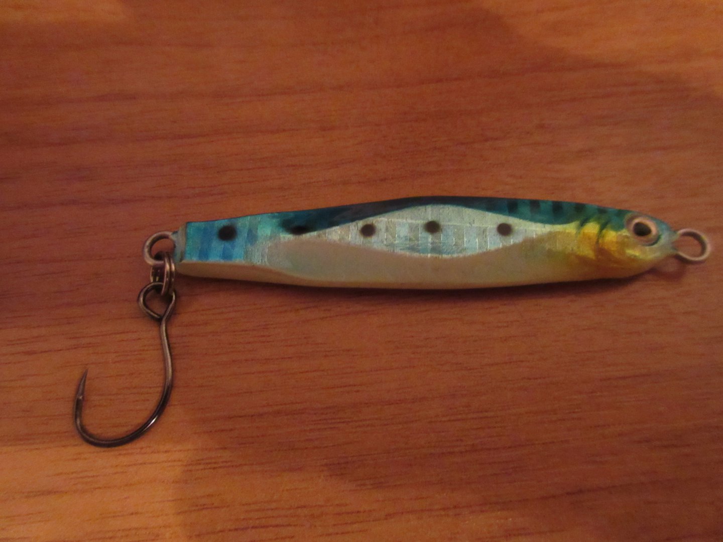 Воооооот, и у меня остатки горсти именно таких, в ТАКОМ цвете и форме. Хорошие пилькеры. Я вот только поздно экспериментировать стал с подгибом пилькера. Так делал: под хвост и башку пилькера клал прокладки жоские толщиной где то 4-5мм, и давил на середину капролактановым прутком диаметром писят мм, скатом прутка. Пилькер становился пологой скобкой. Это его пробовал на границе струи/тиховодья запускать, так вот он падает интереснее и именно в тиховодине (чуть со струи в сторону) и рыба отзывалась чаще чем на прямой пилькер - именно на падении в полводы. Только вот лак на пилькере жёстковат и порой лопается, ну я поднятое ножом обрезал и восполнял лаком.Только на этот сезон одинарников купил, буду на пилькера ставить.