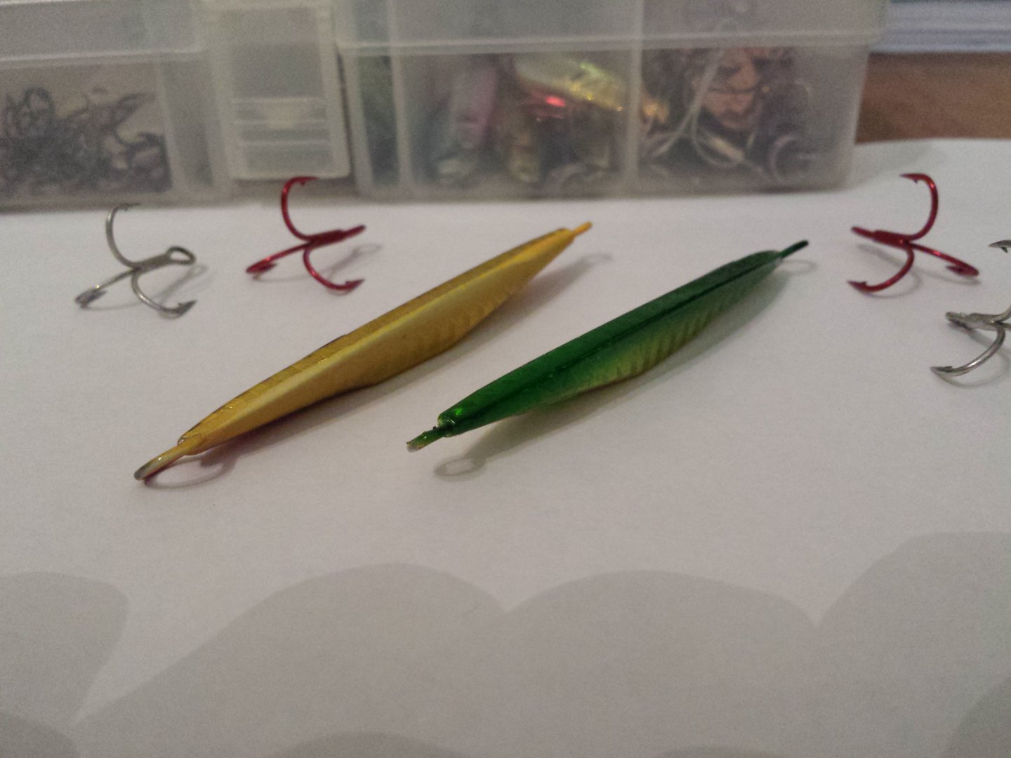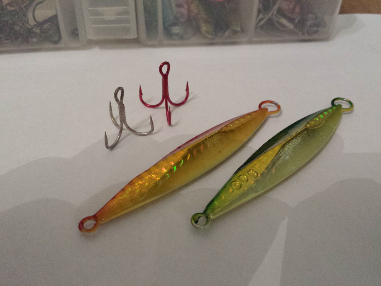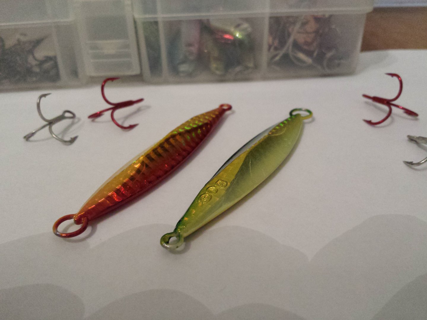 Добрые люди помогли приобрести такие вот безделушки. пилькер 30гр...таких как раз и не хватало...на тот случай когда надо пробить ветер...как видно приманка с некими гранями что должно положительно сказываться на собственной игре и на падении...посмотрим.прикинул какой тройник оптимален.пока видится мне Овнер 46ой.6ка. 5ка.