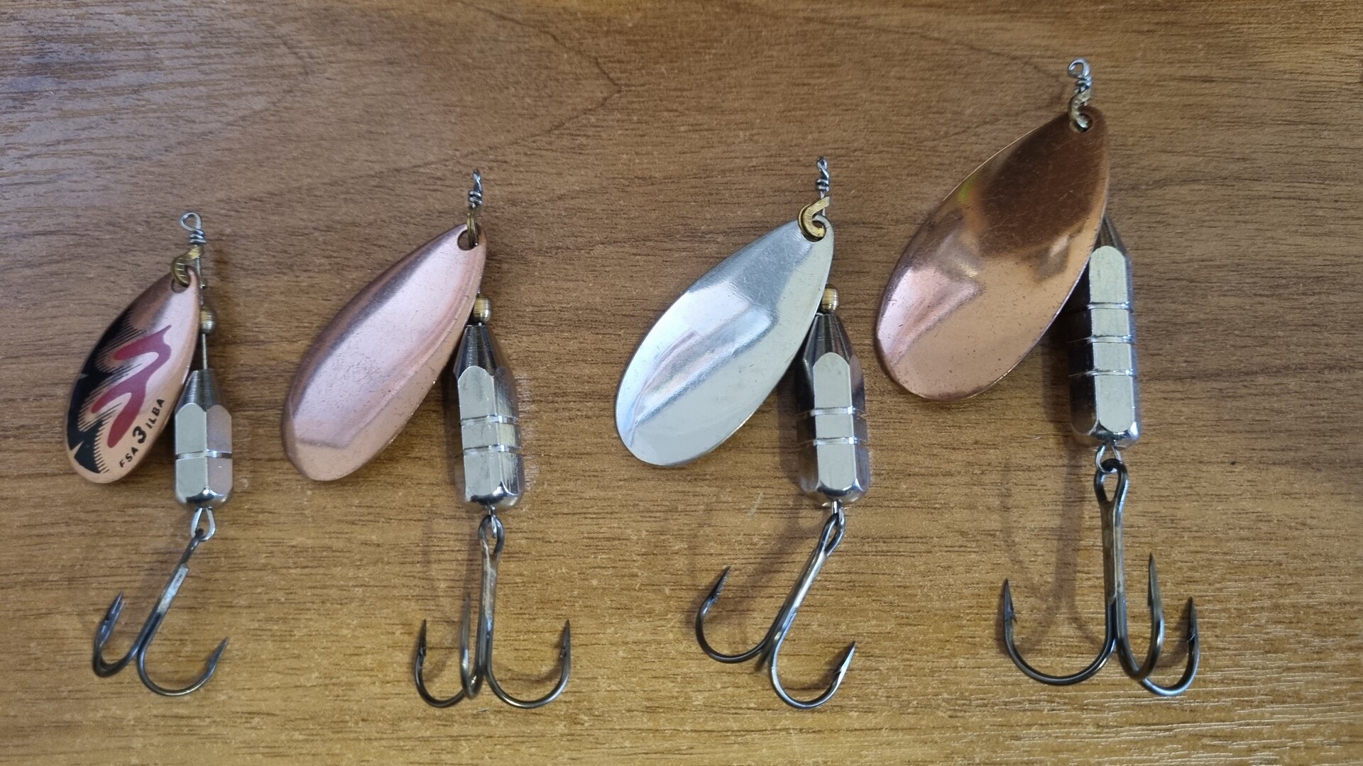 А мне одну 3-го оазмера не взял?Приобрёл себе вот таких недорогих блёсен с тяжёлым сердечником.У меня таких блёсен есть парочка во 2 размере .Появились они у меня в коробке в 2007 году.Есть ещё несколько моделей(но этих очень мало осталось) .Хороши тем ,что их из-за тяжёлого сердечника не выносит на поверхность течением.Приобрёл в большем размере.