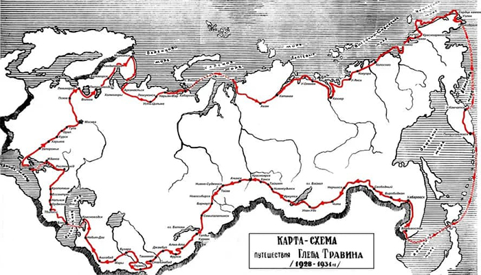 Травин мечтал о кругосветном путешествии. Понял, что выехать из страны не разрешат, изменил планы и задумал объехать вдоль границ молодого Советского Союза — для тренировки. Объявив свой поход пропагандой физкультуры, под шумок первой пятилетки Травин выпросил у исполкома Петропавловска-на-Камчатке отличный американский велосипед, который специально для него был доставлен на пароме — дорожный Princeton, модель 404 в одной из двух стандартных расцветок — красный с белыми эмалевыми стрелами на раме. И раз уж речь зашла о велосипедной экзотике, тренировался Травин на армейском складном Leitner, который то ли он сам, то ли его биограф Александр Харитановский ошибочно называли иностранным, а ведь собирался он в Риге, на фабрике российского инженера, предпринимателя и пионера отечественного велостроения Александра Лейтнера, чья история заслуживает отдельного рассказа.