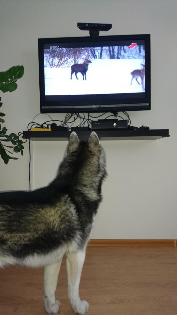 Смотрел сейчас Охоту и рыбалку, чувак на оленей охотился. Они там пищать начали, так пёс мой аж с другой комнаты примчался, уселся и наблюдал за процессом.