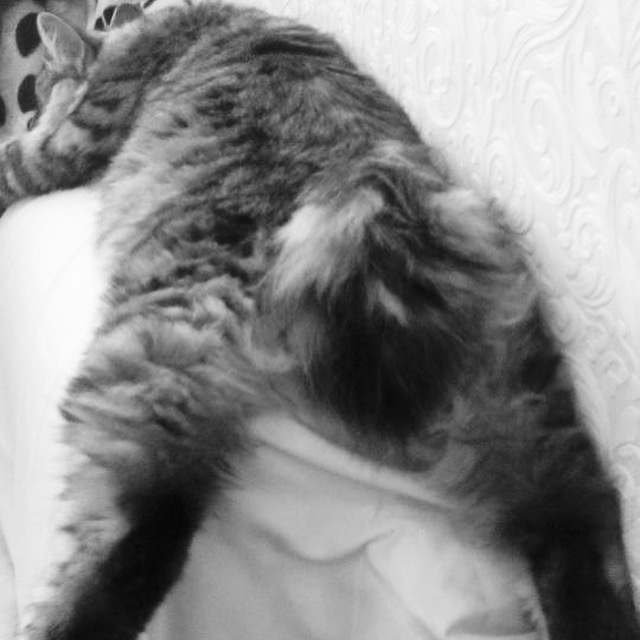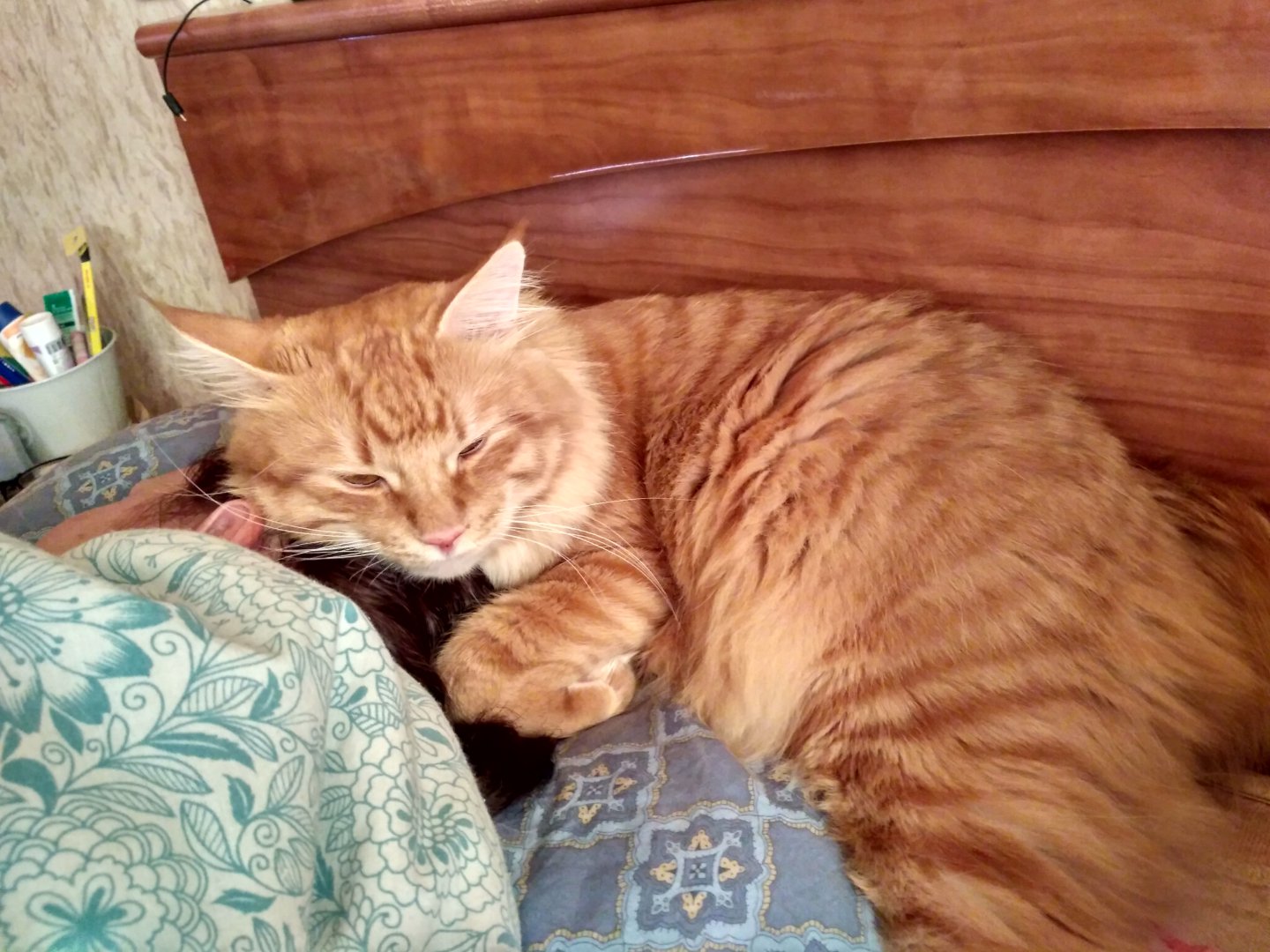 Этот тип, рыжей наружности, испереживался что семь утра уже прошло, а хозяева еще не встают. Периодически приходит со своей лежанки, взгромоздится на подушку, печально вздохнет и прикрыв глазки ждет когда его кормить будут :) .
