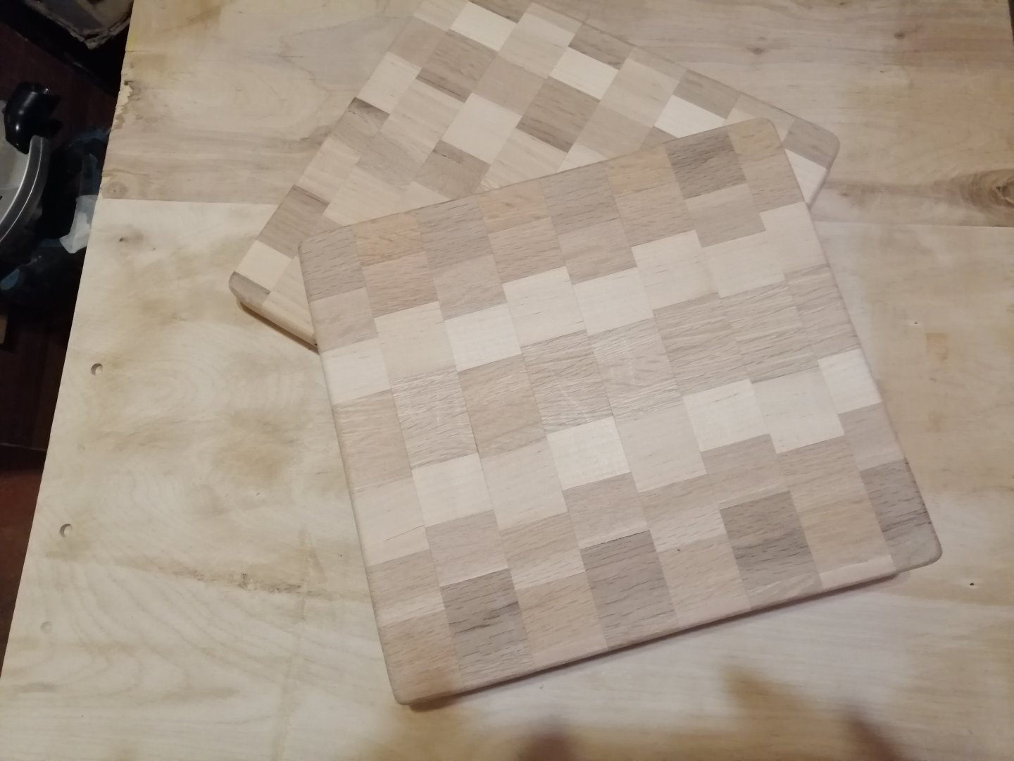 Работа аккуратная и достойная уважения, но это (извините) - не торцевая разделочная доска. У торцевой разделочной доски поперечный срез волокон выходит на рабочую поверхность доски. В этом и есть смысл именно торцевой разделочной доски: при работе на ней ножом (тесаком, топором) торцевой срез раздвигается при резе, потом стремится самозатянуться. Поэтому они (торцевые разделочные доски) гораздо менее подвержены выкрашиванию (удалению) древесины при работе на них ножом.