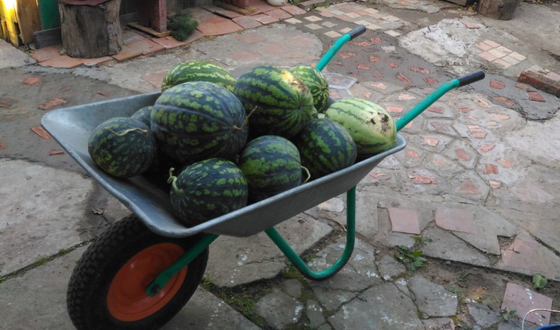 Арбузы сажу в парниковую грядку (все что в компостной куче ) делаю большие лунки и в них песок с небольшим количеством перегноя . Всю грядку накрываю полиэтиленом. Вырезаю круги диаметром около 10 см в них рассаду под обрезанные банки 5-10 л. из под воды. (низ обрезан, пробка откручена).