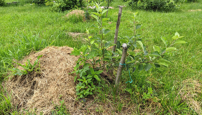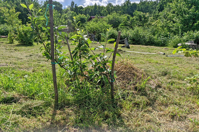 Далее - груша. Сажал я ее одновременно с Сашей Беловым - в сентябре, осенью 2020 года. Сажал на бугорок с наклоном на юг. Их у меня две, с разными привоями. Бесснежную зиму с 20 на 21 года перенесли хорошо. Зимой этого года на одной из них, которая на фотографии, выше корневой шейки мыши съели 2/3 коры от окружности, думал хана. В апреле замазал варом съеденное и опять накрыл лутросилом. Прирост зеленой массы, на мой взгляд слабоват, особенно в прошлом году, правда волчки некоторые, я на днях выломал, пока они молочные. Но, в этот год груша зацвела и пытается выносить два сигнальных плода. Бугорок, в который сажал - сравнялся с землей, поскольку ямку я все-таки копал, а зря.