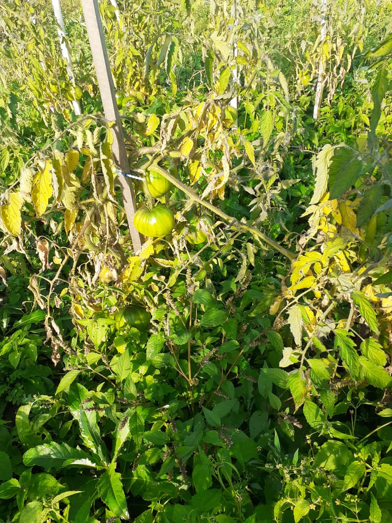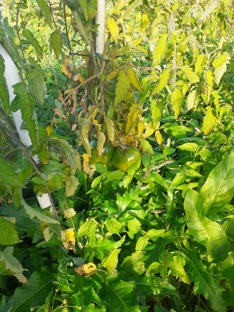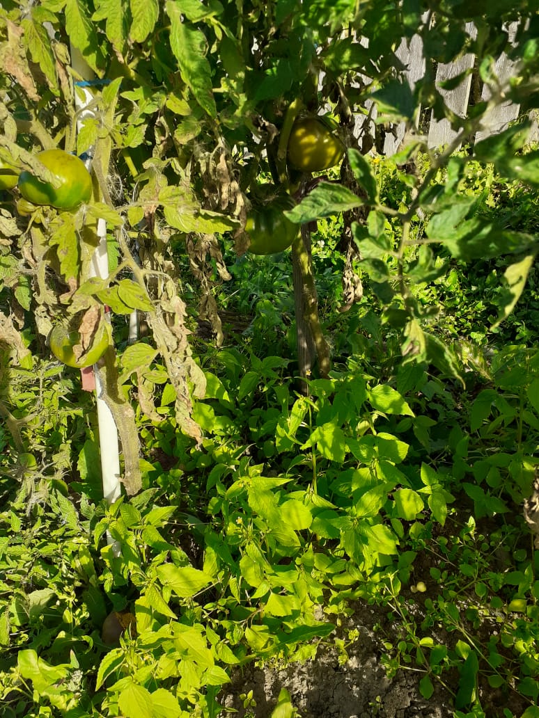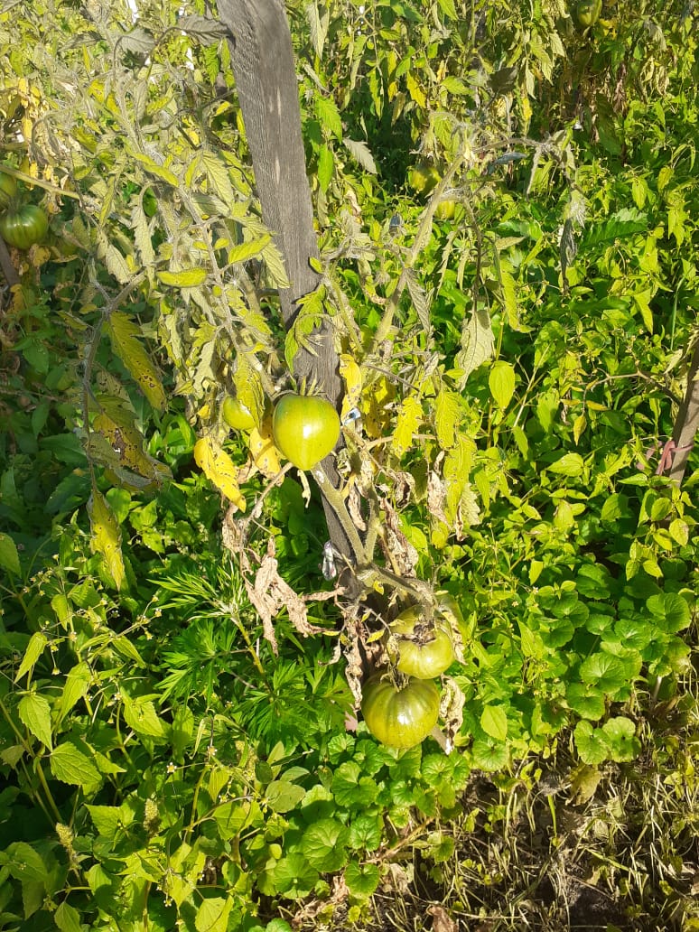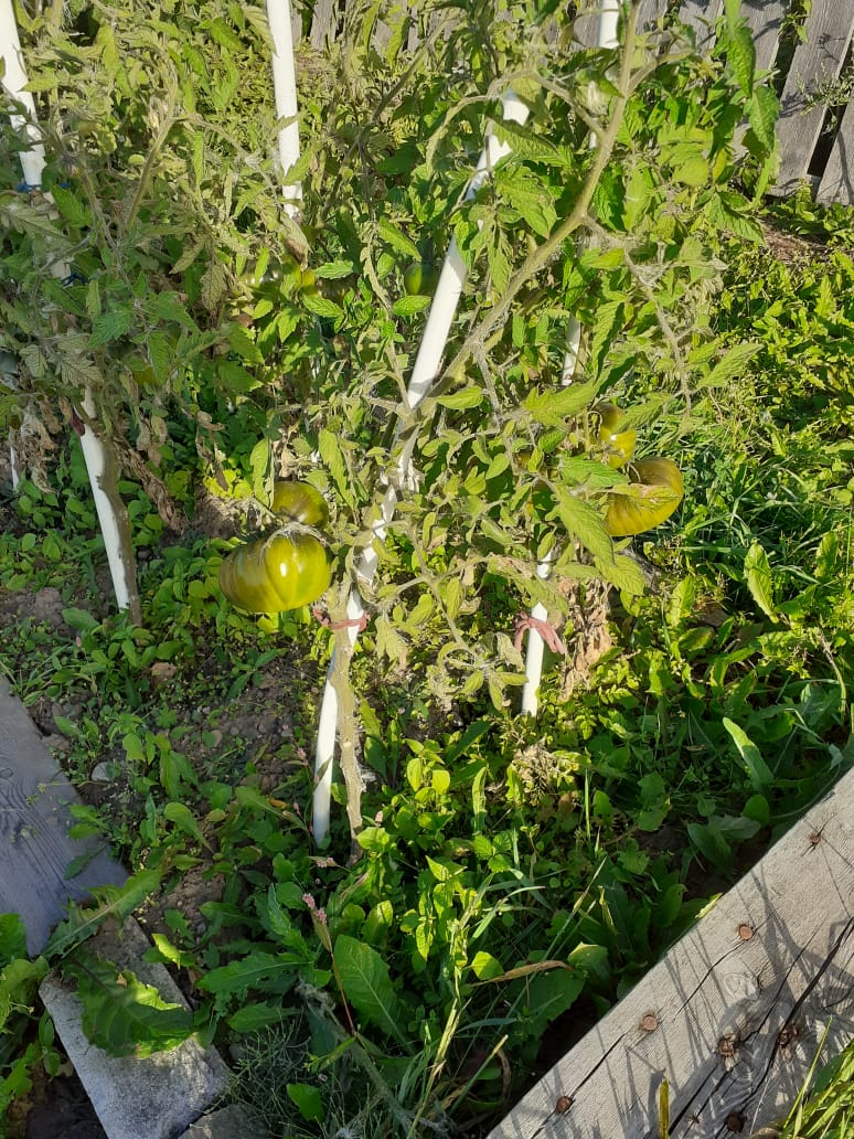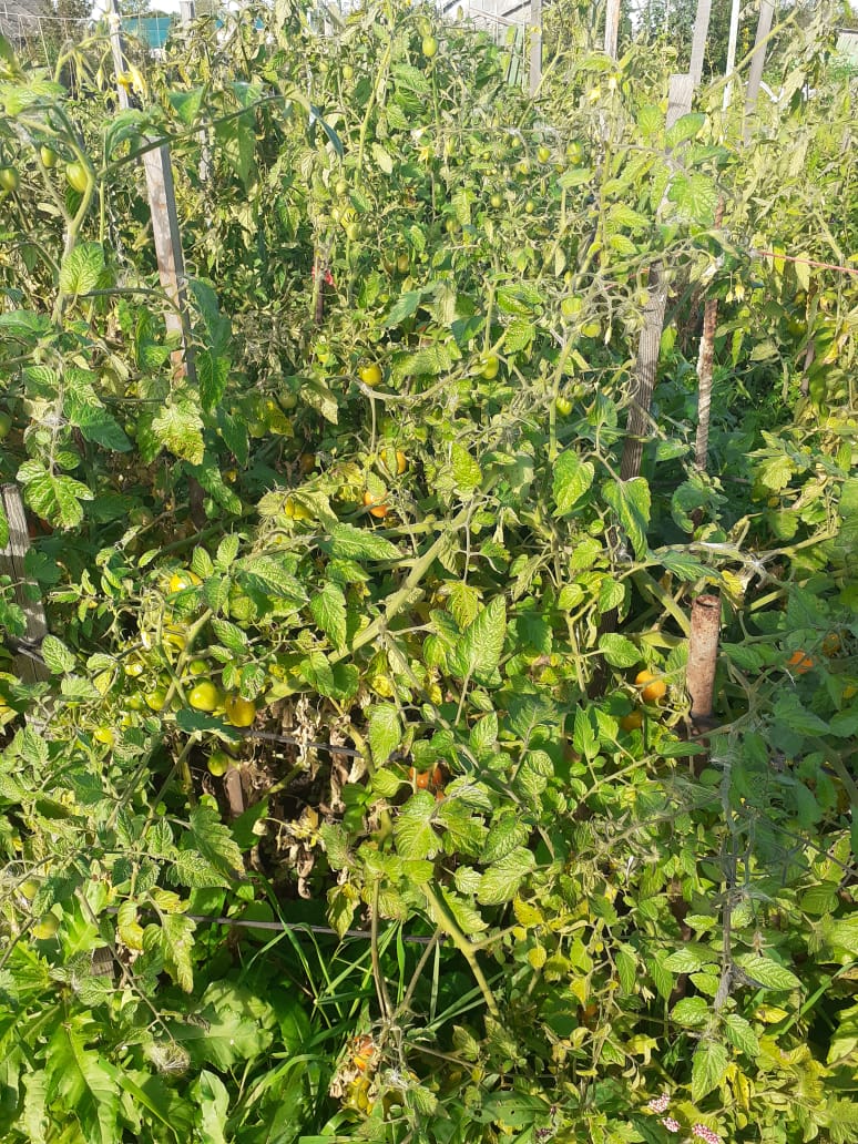 Сегодня рано утром на траве был белый налет, похожий на иней. А у меня все вот так еще. Красные помидоры собрал, а с этим что делать? Траву на грядках уже не дергаем, она хоть немного от холодов укрывает. Ну, завтра бурые еще соберу, остальное наверное в топку:
