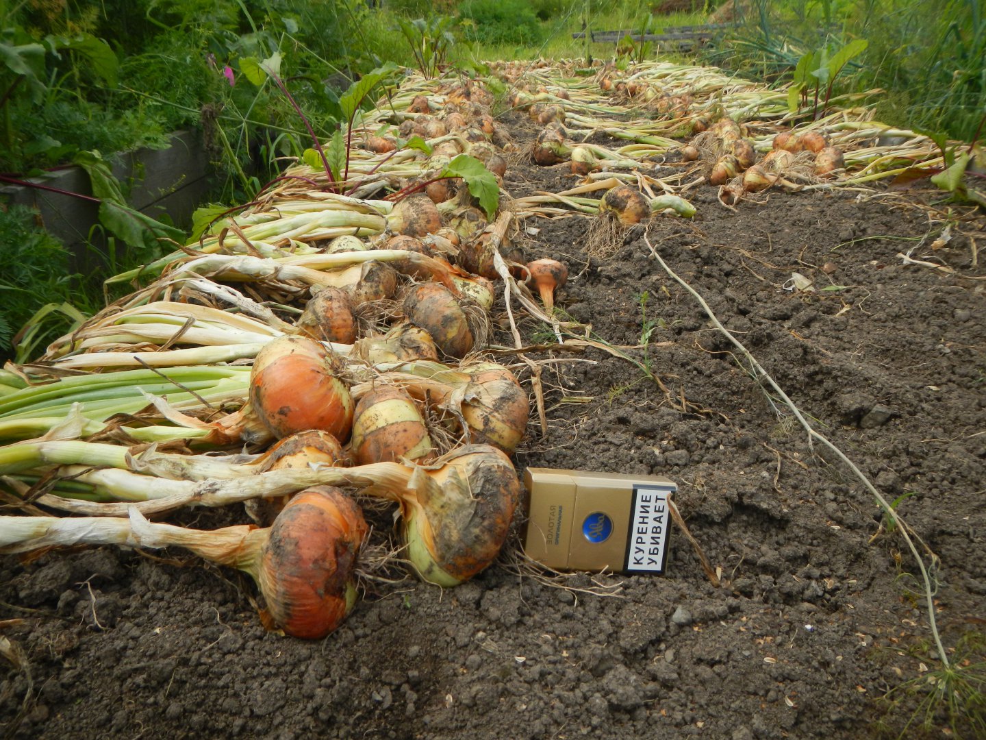 само оно по времени. мы уже собираем. перед сбором урожая за неделю перо у лука пригибают к земле. главное подобрать момент что бы неделя стояла сухая, с минимумом осадков. тогда лук лучше храниться будет. после сбора лук просушить надобно. я на чердаке рассыпаю и он лежит сохнет.