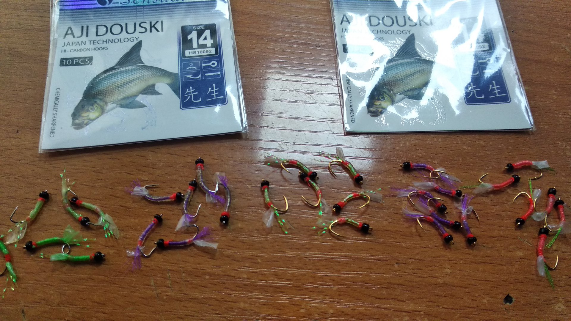 Мне кажется чёрная бусинка очень большая, а это (опять же на мой взгляд) даст минус процентов 30-50 уловистости. Попробуйте сделать бледно фиолетовую только вместо бусинки монтажной нитью чёрную головку.