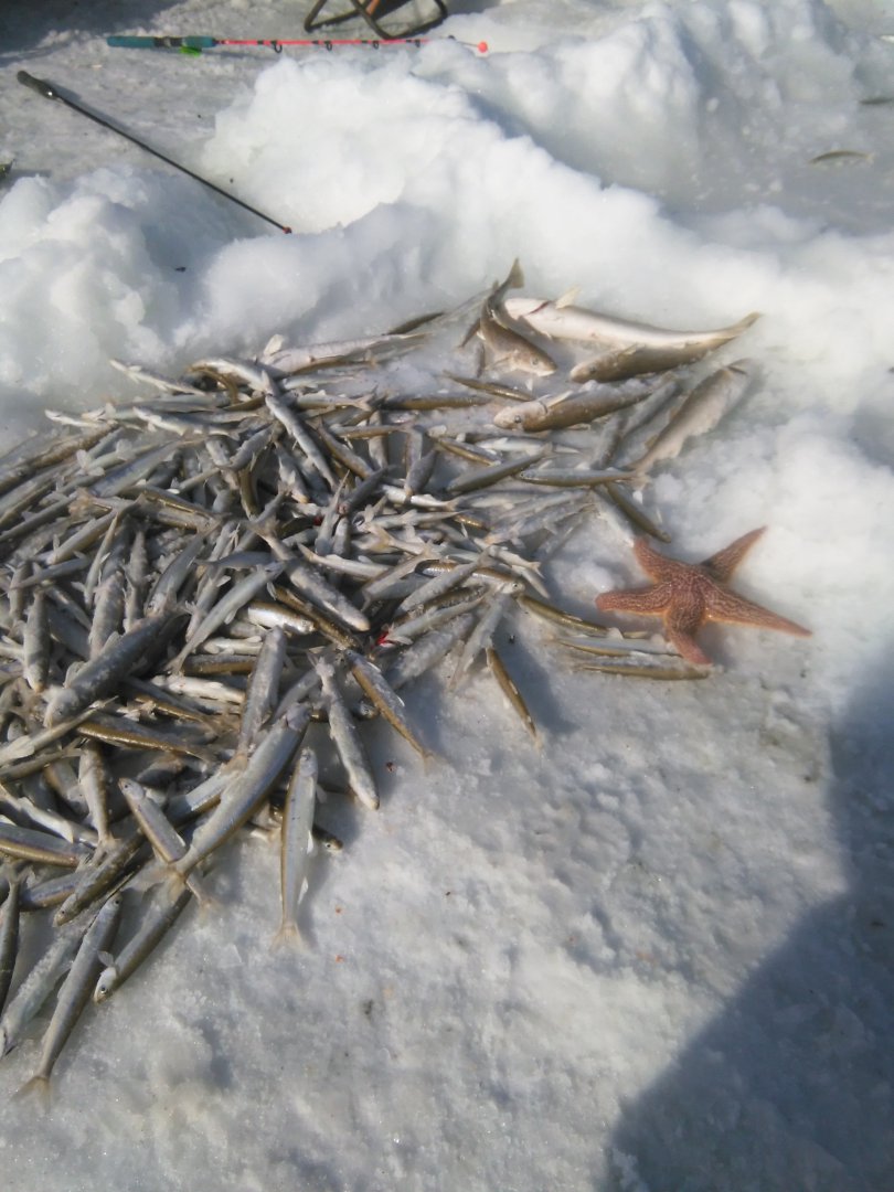 Съездили подышали морским воздухом с 14 по 17,самый удачный день по улову получился 17 хотя весь день и задувал не слабый ветерок.Рыбачил и на блёсна и на самодуры,на самодуры поймал больше,основная масса рыбы передвигалась в метре подольдом и блёсенки по долгу на эту глубину погружались,плюс из-за ветра тяжело было попадать в лунку блёсна всё время сдувало.А так в целом отдохнули неплохо.