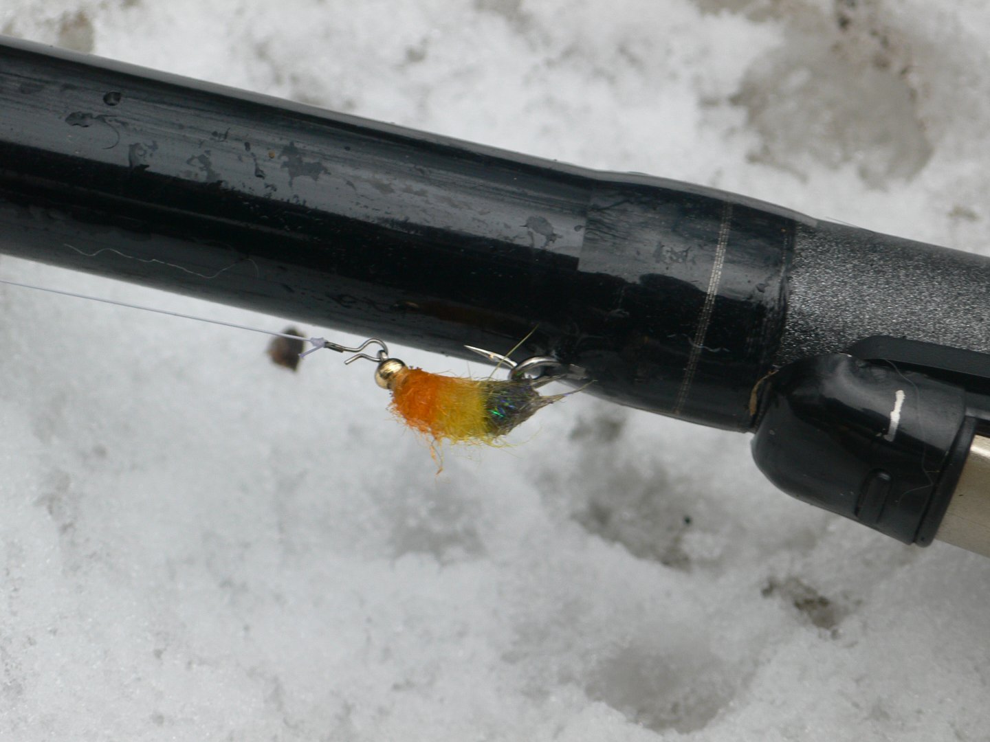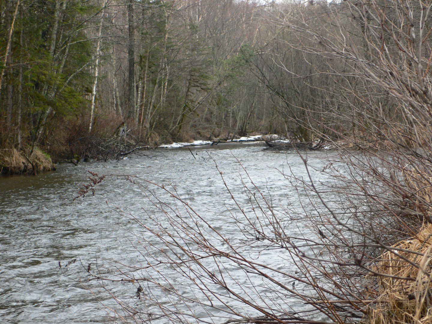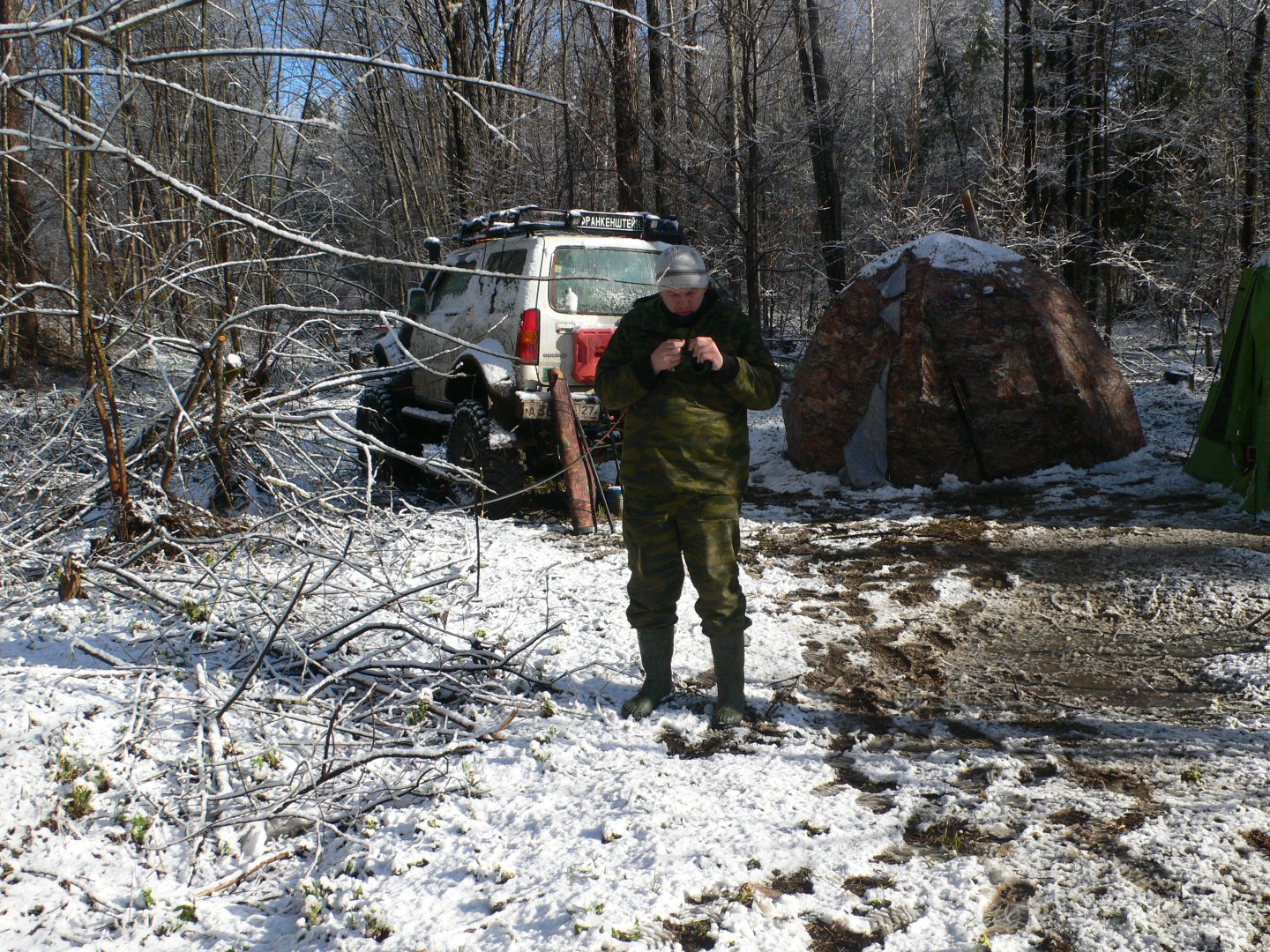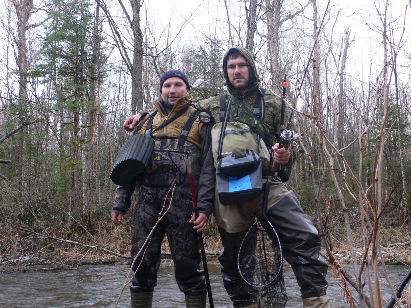 А где такую петельку брали?Утро встретило нас в неожиданно весенне - зимнем наряде, и на удивление нормальной погодой, которая к обеду к сожалению вновь испортилась. С утра кто по чашке чая, а кто и напитки по крепче, и на рыбалку. Уровень совсем не радует, да к тому же еще и прибывает. На ту сторону еле пробрались через сломанный мост. Наконец то пришли на заветные места, все в предвкушении рыбалки, но рыба отказывалась брать, до обеда поймали 7 харюзов. Решили вернуться на табор, пообедать.
