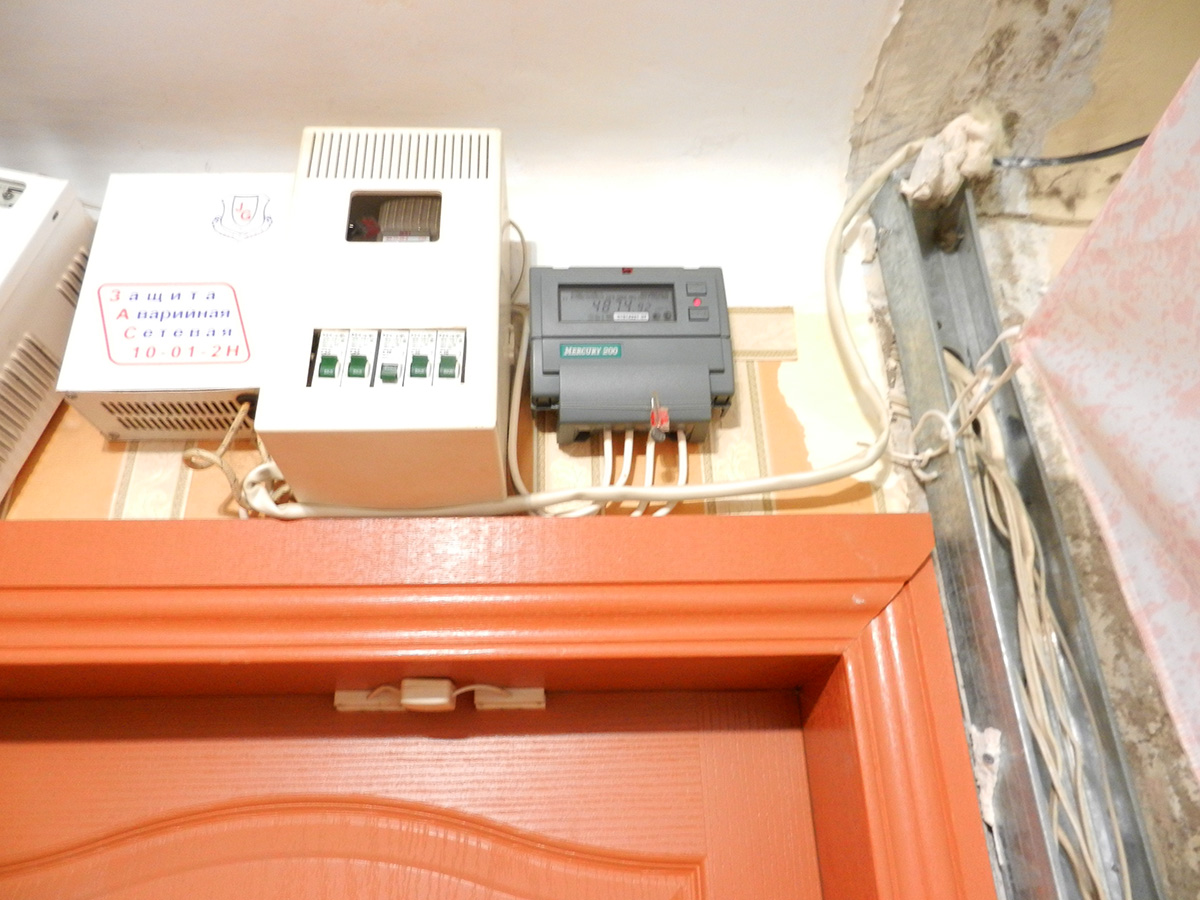 Не увидел особого криминала. Поставили дешевый щит, вместо железной площадки с пробками и счетчиком. Счетчик Меркурий не влез, т.к. широк под этот щит, поставили рядом. Ставили видимо давно, скорее электрики с ЖЭУ. Чтобы провода, которые были изначально не наращивать, щит поставили на старое место-над входной дверью. Сделано очень бюджетно и предельно просто. Конечно, при нормальном ремонте нужно все это переделать.Они провода замуровали в пол под ванной комнатой, после первого потопа, где-то что-то коротнуло.
