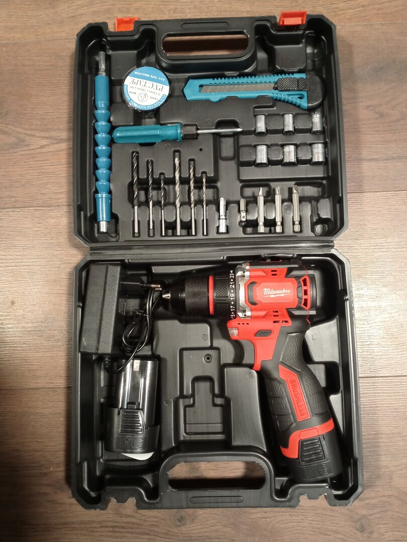 Посмотрел на Игоря, и тоже взял такой. Кейс и что внутри из мелочи ггг редкое, а вот шурик прям вкатил. Маленький, мощный. Но радость была не долгой, два просверленных отверстия и пяток закрученных саморезов. И всё отказался работать. Батареи норм, а он не работает... Потом зашёл в отзывы на маркетплейсе, а с такой бедой я не один... Сделали возврат. Плата управления горит...