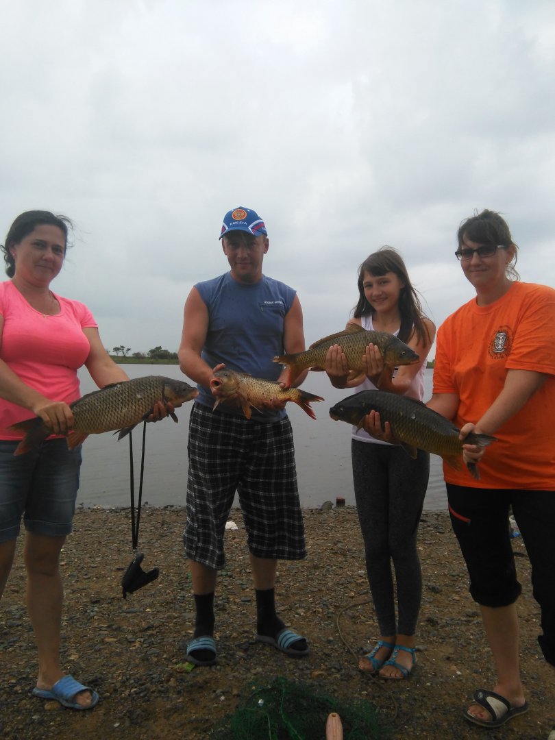 Транзитом с моря заехали в гости друзья из амурской области и попросили показать как мы сазана ловим.Карповики отпали как вариант сразу за пол дня наврятли срельнули бы,а вот фидер само то.Пол девятого утра забираю Наталью с работы,быстренько домой,собраться быстро толпой не получилось и к воде мы подъехали часикам одинадцати.Замешал прикормку карп-микс и сазан от Миненко по одному кило.Пять кормушек в точку,цепляю паводок,на крючке перловка и кукуруза.Первый час было так.