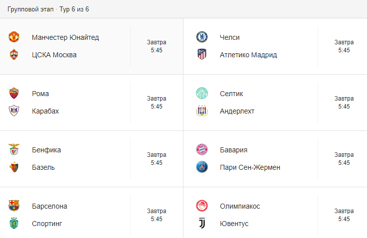 Победители групп: "МЮ", "ПСЖ", "Рома", "Барселона", "Ливерпуль", "Манчестер Сити", "Бешикташ", "Тоттенхэм".