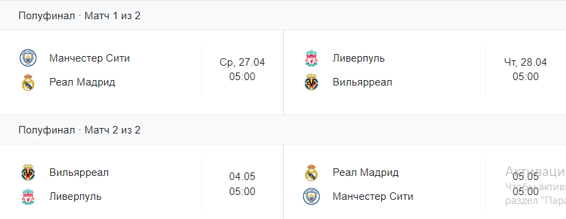 Первые матчи пройдут 26−27 апреля, ответные — 3−4 мая.