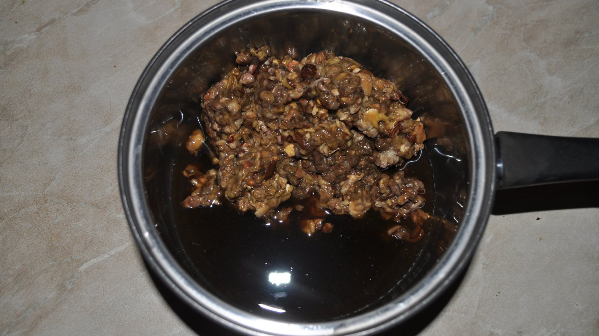 Приготовление. Грибы чистим от грязи (не моем), крупно режем засыпаем солью, ставим на сутки под гнёт. За это время из них должна отскочить вода. Воду сливаем, процеживаем от мусора, грибы прокручиваем на мясорубке. Затем на мясорубке прокручиваем также лук, чеснок и имбирь. Смешиваем грибную воду, прокрученные на мясорубке грибы и лук с приправами, измельчаем всё блендером. Добавляем в кастрюлю уксус и стакан чистой воды, лаврушку, гвоздику, тушим до выпаривания лишней жидкости до консистенции густого кетчупа. Затем вливаем вино, размешиваем, нагреваем до кипения, снимаем с огня. Раскладываем по банкам, пастеризуем, если планируем хранить долго.