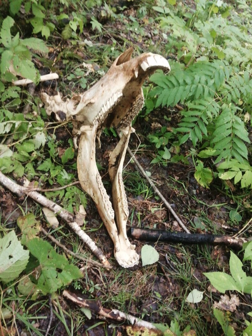 Были еще кости, этот череп С виду не один год лежитКаровы. Которая поела не тех грибов. А скорее всего - так, если серьёзно: лихие люди прибрали/разобрали скотинку, пасшуюся скраю леса, а с головой возиться - ломы. Где то и шкура с копытами должна рядом быть.