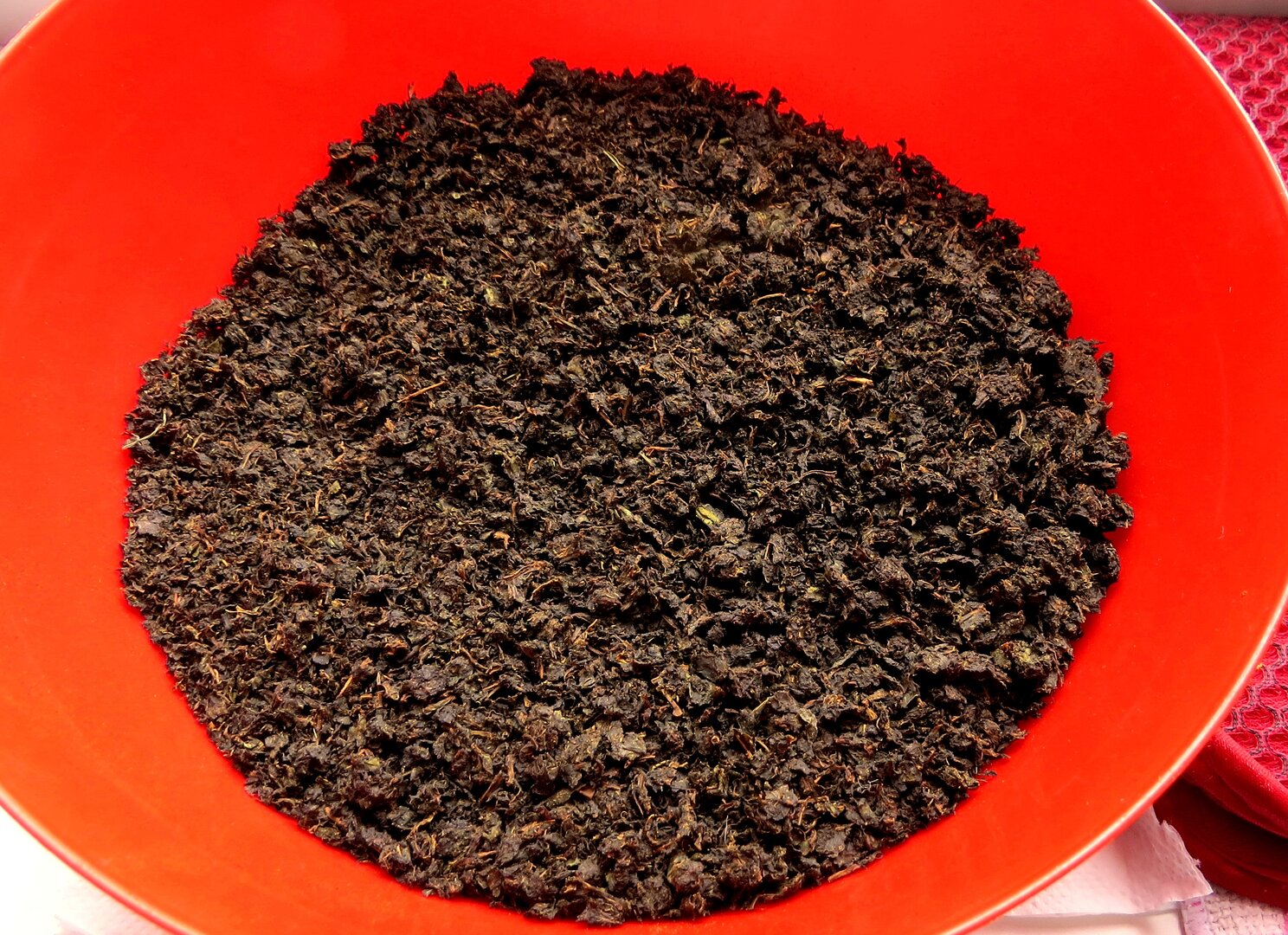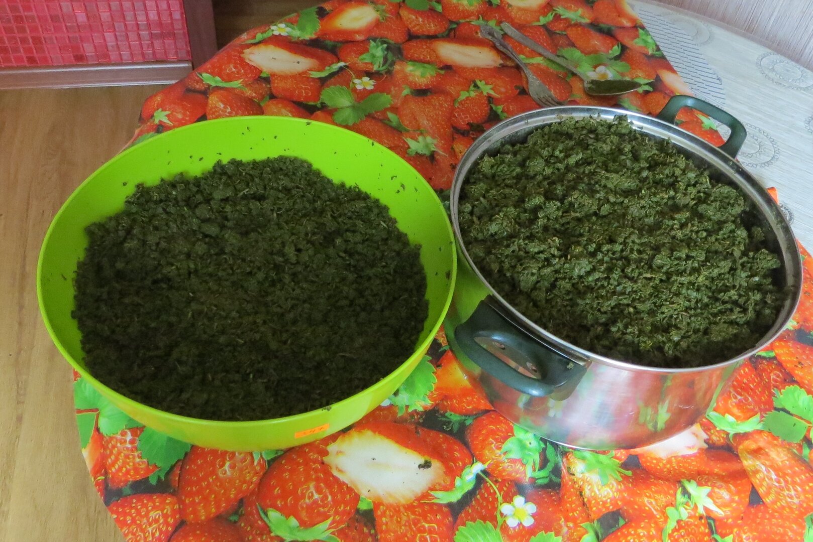 Перемалываем листья через мясорубку с большими отверстиями и отправляем на ферментацию часов на 12, накрыв мокрым полотенцем