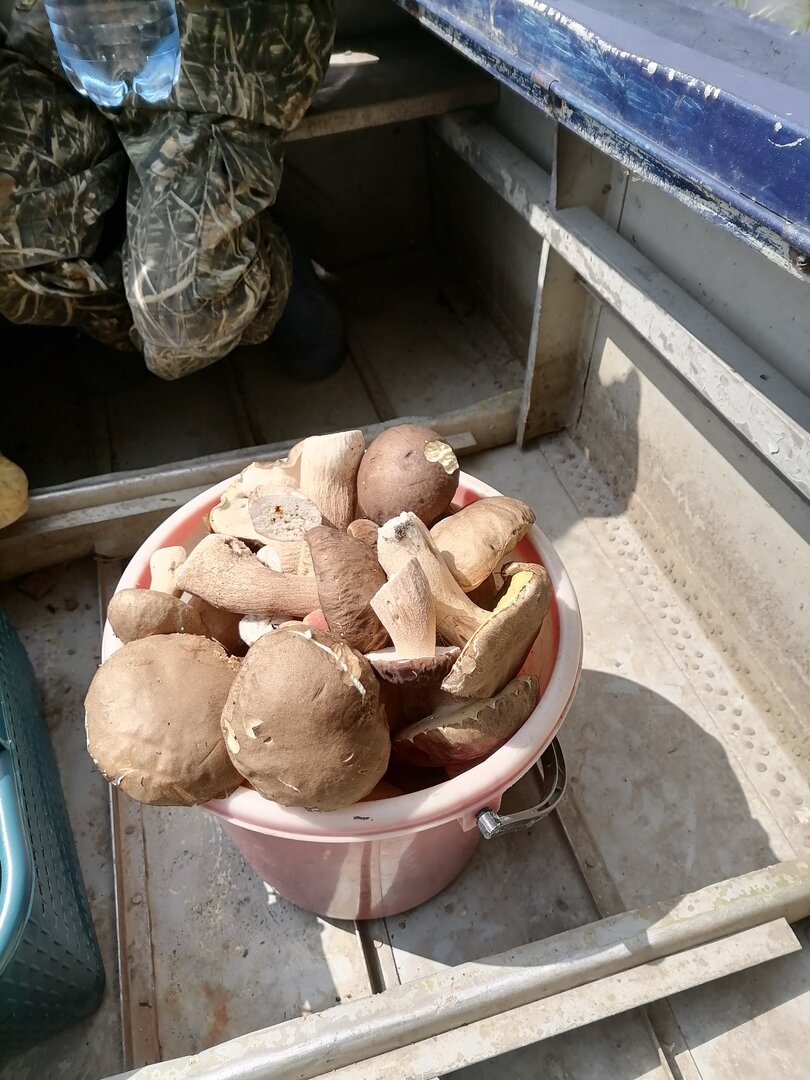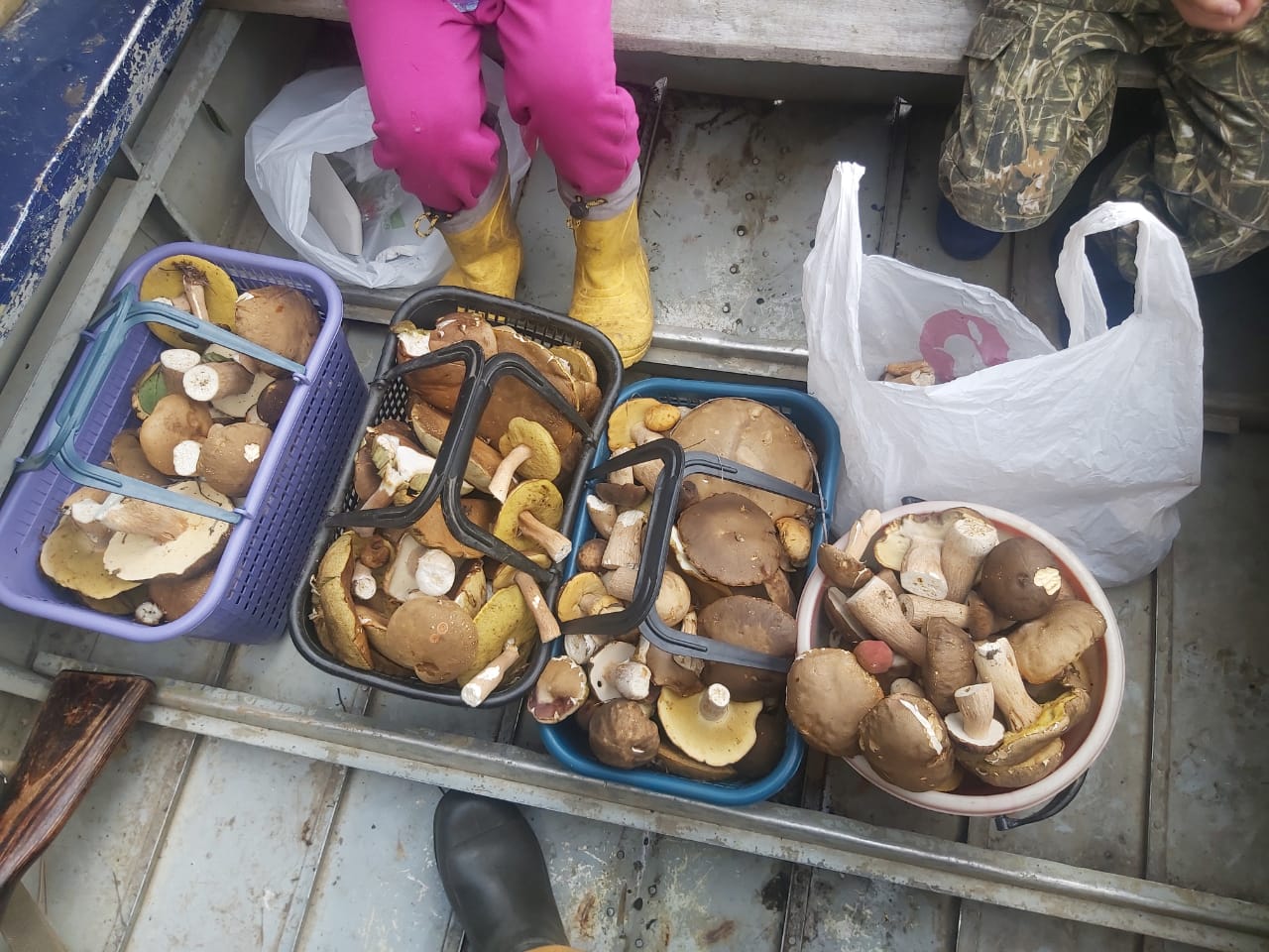 В общем начали сбор грибков часов в 9 закончили в 11. На обратном пути прямо сидя в лодке, посреди глади озера на ветерке пили чай с припасами отдыхая от назойливых комаров.