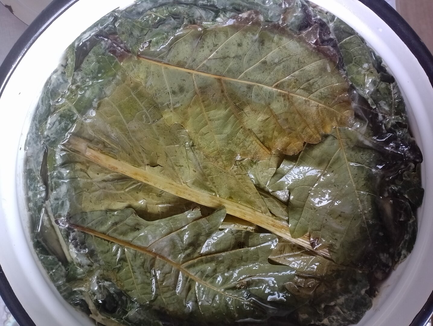 Далее, дно эмалированной ёмкости укрываю листом хрена
