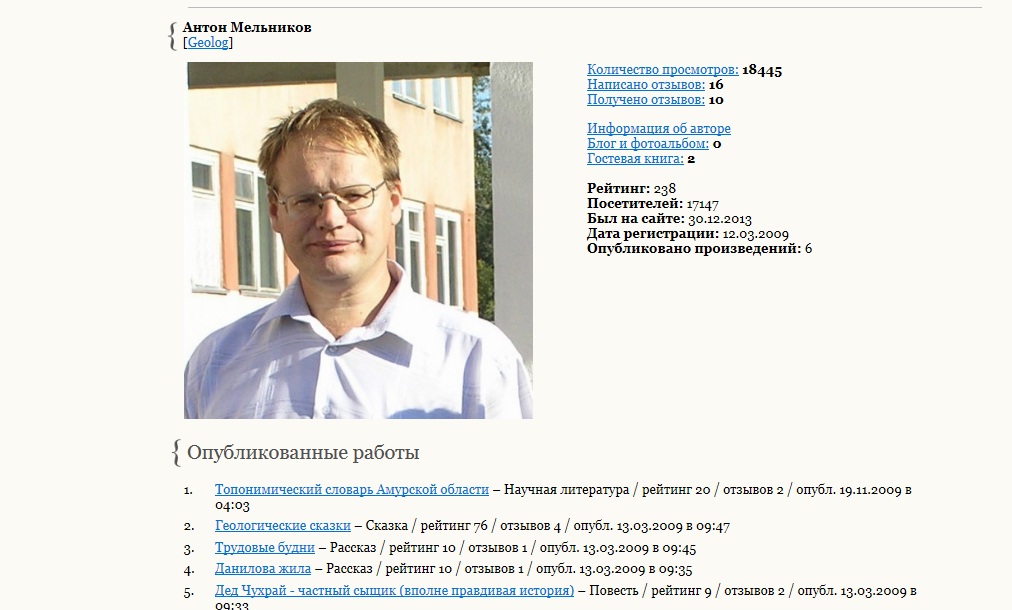 Как-то не убедительно мужчина сказал.Кому надо его подставлять, причём с оглядкой на возможную будущую известность и признание читателей? И скажите ему что бывших Амурчан не бывает!Может кто-то из бывших амурчан меня подставил, кто меня знает. Я даже не знаю кто, круг подозреваемых широк. Попробую пошукать кто-это. Антон Мельников.