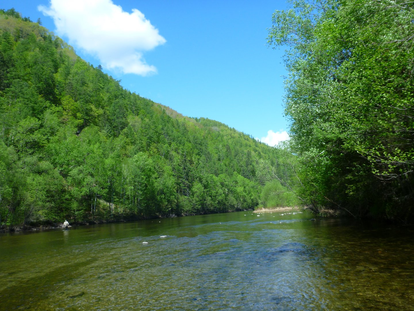 Не ожидал такой подставы, увидел ситуацию за 10-15 метров сразу после выхода из за поворота, пришлось уворачиваться на скорости 40. Полицейский разворот был невозможен из-за сильного течения и продольных лесин по течению . Результат - столкновение с такой лесиной, около полуметра в диаметре, и вылет на внешний залом. Снялись без лебедки. Координаты залома N49°21'56,47" E134°47'01,17"