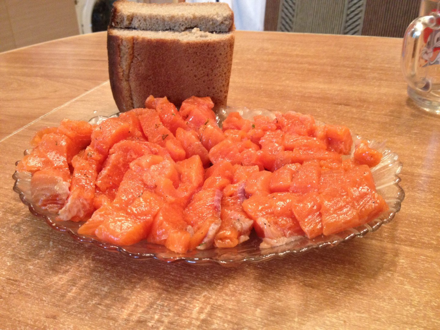 С начала заморозка 4 суток в морозилке. Потом сахар, соль натираем 1/3. Посыпаем свеже рубленным укропом и на 12-20 часов в холодильник на верхней полке.