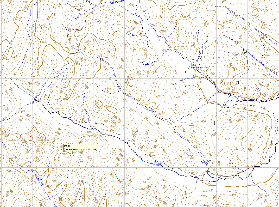 Рельф не очень видать, можно только догадываться по ручьям и резким изгибам реки. А это условие одно из ключевых, когда ориентируешься в отсутствии дорог.