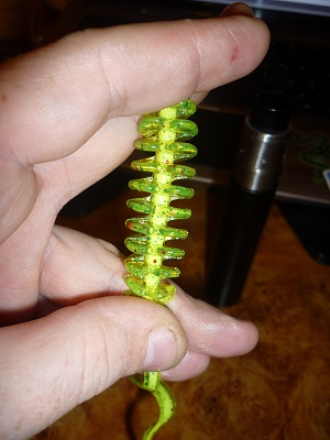 Для тех кому интересно - у данной резины "центральный стержень" в который продевается крючок - он очень тонкий, на фото ниже видно. Сами представляете что будет после первой поклёвки с этой резиной. Кстати в головной части утолщения для удержания ступеньки офсетника нет - т.е. голова у данного виброхвоста такая же тонкая как и всё тело.