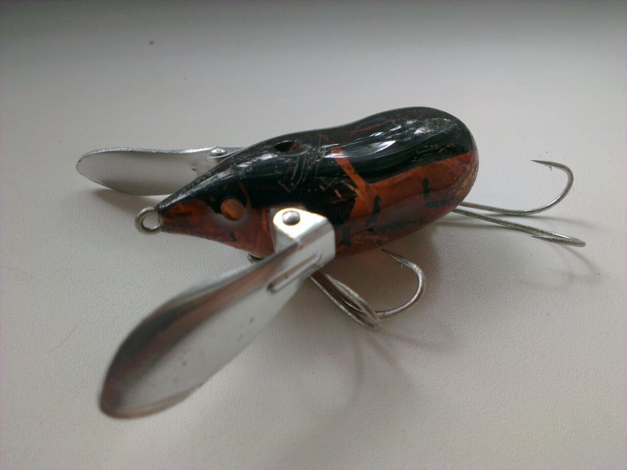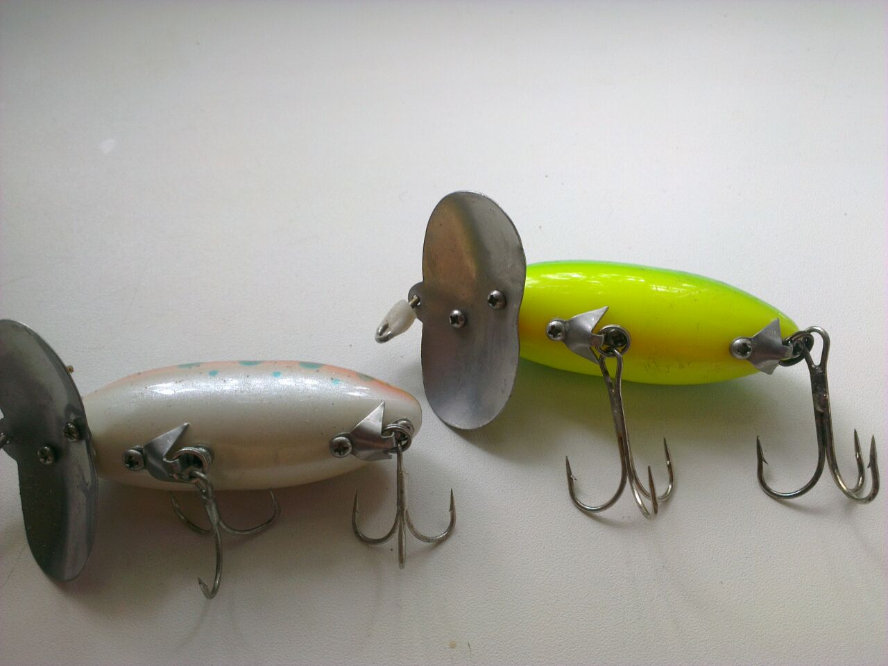 Кстати, о крючках. Заметил, что на двойниках реализация поклевок гораздо лучше, а кроме того легче извлекать и меньше перехлестов (за ночь может всего раз-два был). Еще из наблюдений. Арбогаст, первый на фото ниже - с мелкими крючками, реализация совсем плохая, перехлестов почти нет. Второй с длинными тройниками, реализация уже лучше, но и перехлестов больше. Потому думаю и перевести арбогастов на двойники.