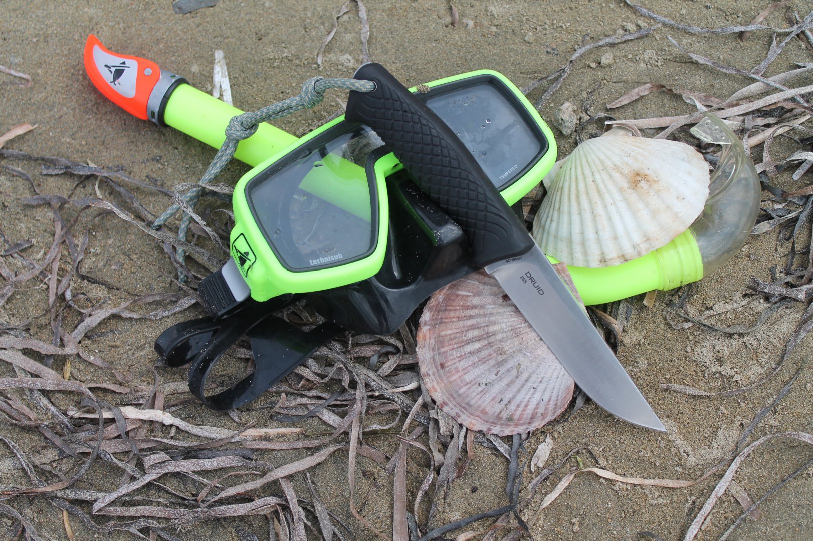 Друид Стилвиловский. Брался под море(нержа+ризинопластик на рукоятке) для работы в воде-рыба,мидий отодрать от скалы.Ножны использовались самопальные из куска метапола и стропы. Родные кожаные.